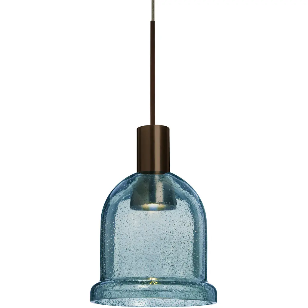 The Kiba Clear Mini Pendant is a transitional design composed of a Clear glass Bell, with an interesting bubble pattern blown randomly throughout the glass The pleasing play of light through each shade's bubble accents make for a striking affect, created by the concealed LED light source positioned at the top glass opening. The 12V cord pendant fixture is equipped with a 10' braided coaxial cord with teflon jacket and a low profile flat monopoint canopy. These stylish and functional luminaries are offered in a beautiful Black finish.