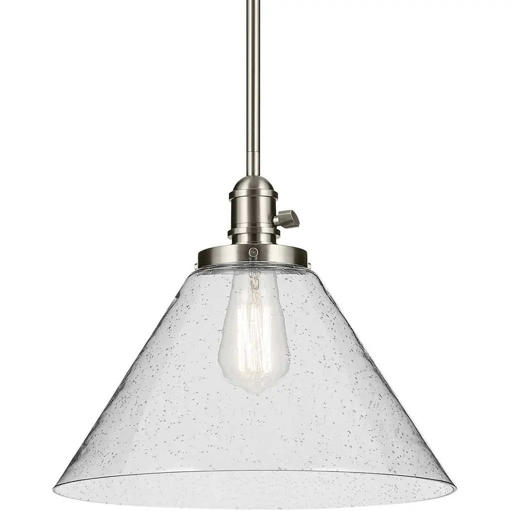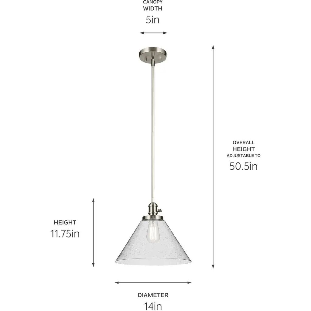 Offering convenience and ease in coordinating with other lighting options, the Avery 1 light pendant is truly as versatile as it is beautiful. Avery creates a classic yet dramatic statement to any space while it complements a variety of decor, including industrial aesthetics. Its shade adds to its charm by providing a beautiful, ambient lighting to the entire room and is easy to remove for convenience and ease of cleaning and replacement. A stem with a functional on/off switch on its socket completes the look.Features:Dimensions:Electrical Specifications: