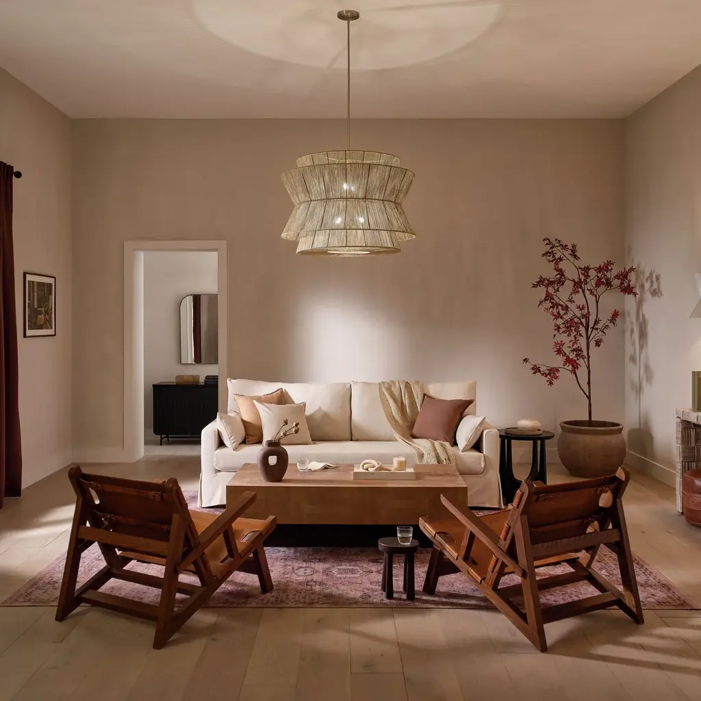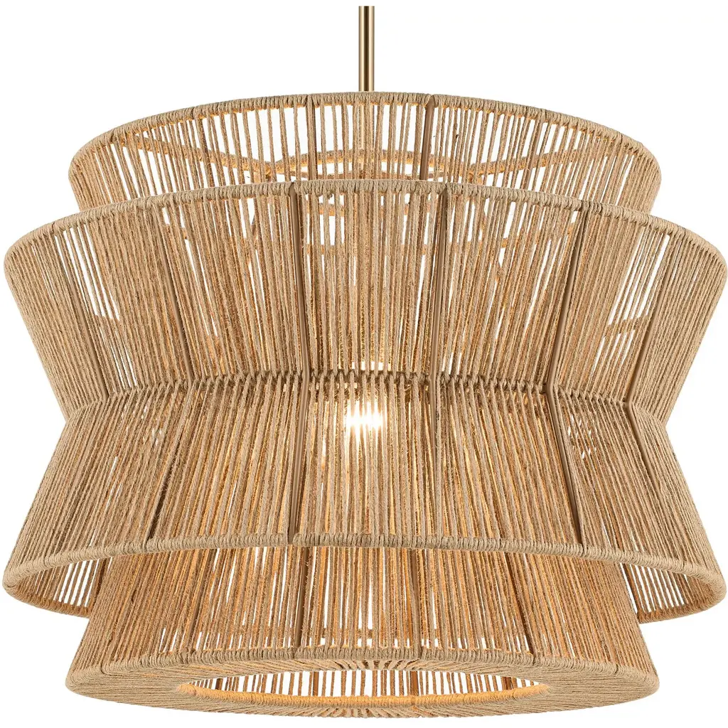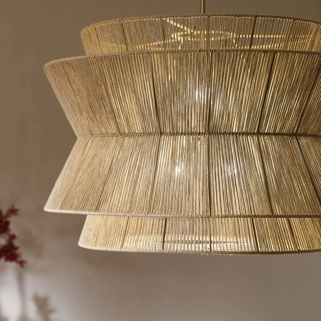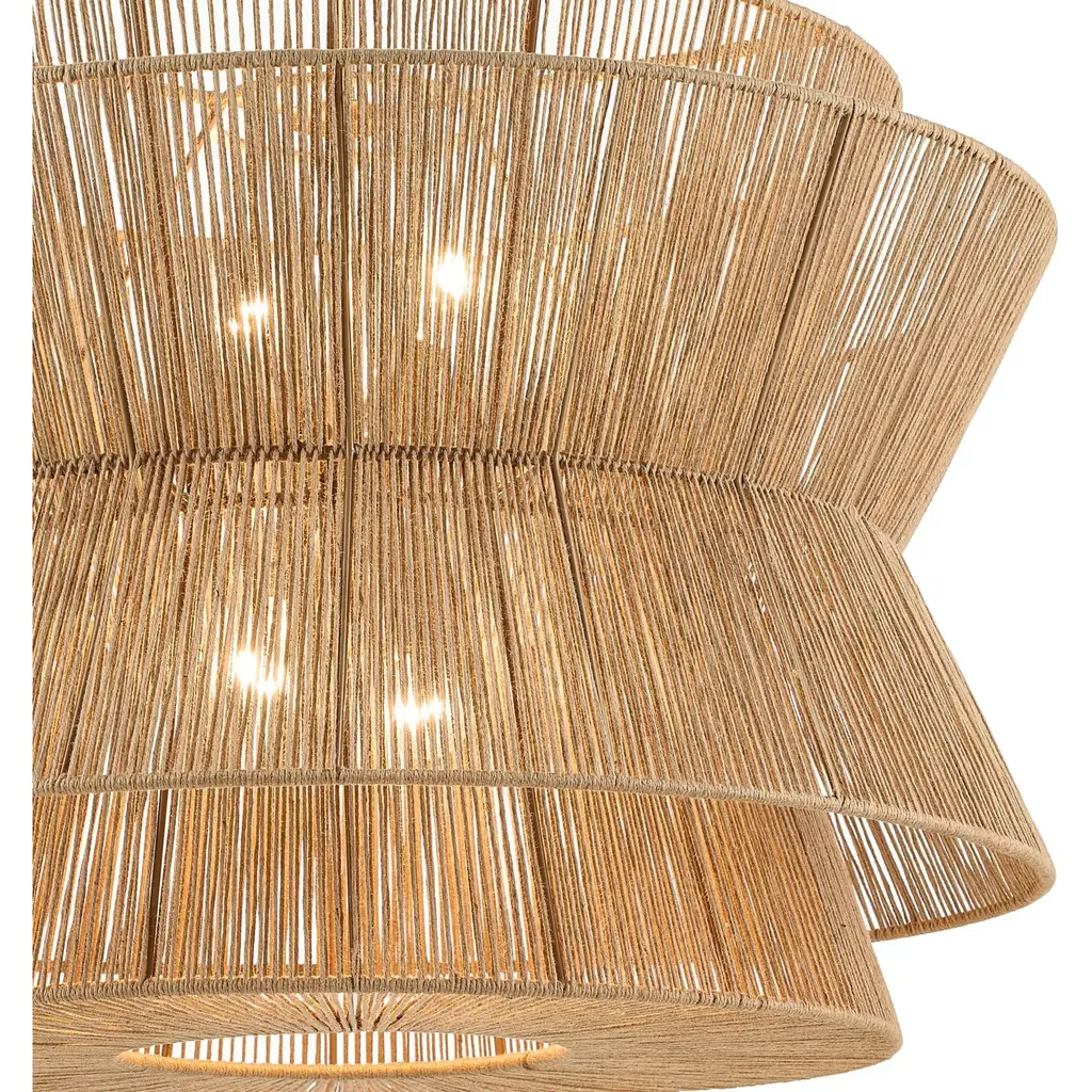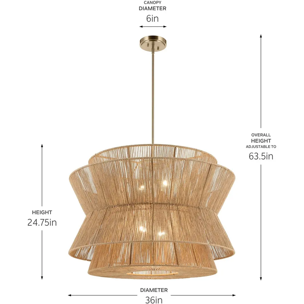 The 36" 4-light pendant light is inspired elegance and organic beauty. Layers of stacked natural jute create an eye-catching fixture. A cluster of bulbs illuminates through the woven layers to create magical patterns, adding a boho charm to any room. The natural jute texture adds that special touch that makes your space feel like home. It measures 24.75" in height and 36" in diameter. Comes with fixture, 6" stems, 12" stems, swivel, canopy, and mounting hardware.Features:Dimensions:Electrical Specifications: