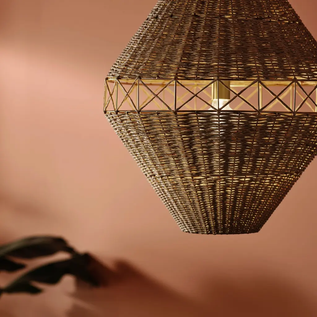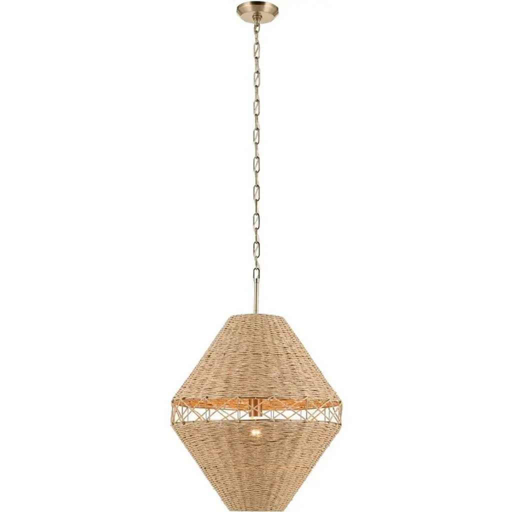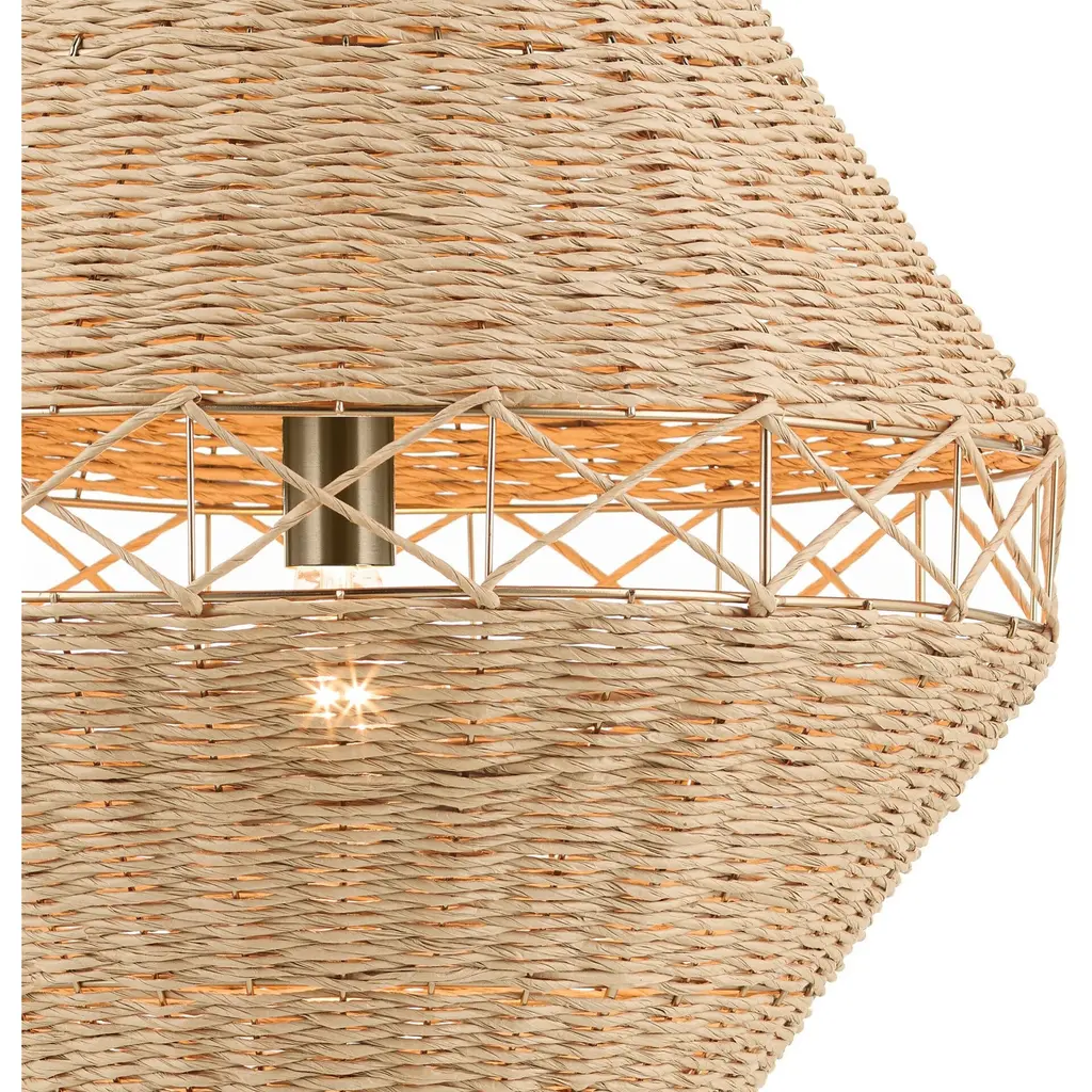 Add warmth and style to any room with the 20" 1-light pendant light. Inspired by the Japanese art of wrapping river stones with natural cane, this fixture features beautifully woven cord. Light peeks through the open pattern, adding eye-catching texture while casting a soft, welcoming glow. It measures 28.75" in height and 20" in diameter. It's cETLus safety listed for dry indoor locations. To clean, turn off electric current, wipe clean with a soft, dry cloth or duster; harsh cleaning products may damage the finish. Comes with fixture, 72" chain, screw collar loop, canopy, and mounting hardware.Features:Dimensions:Electrical Specifications: