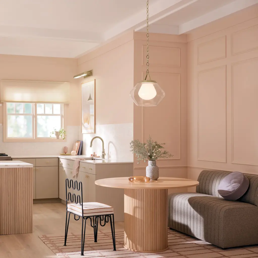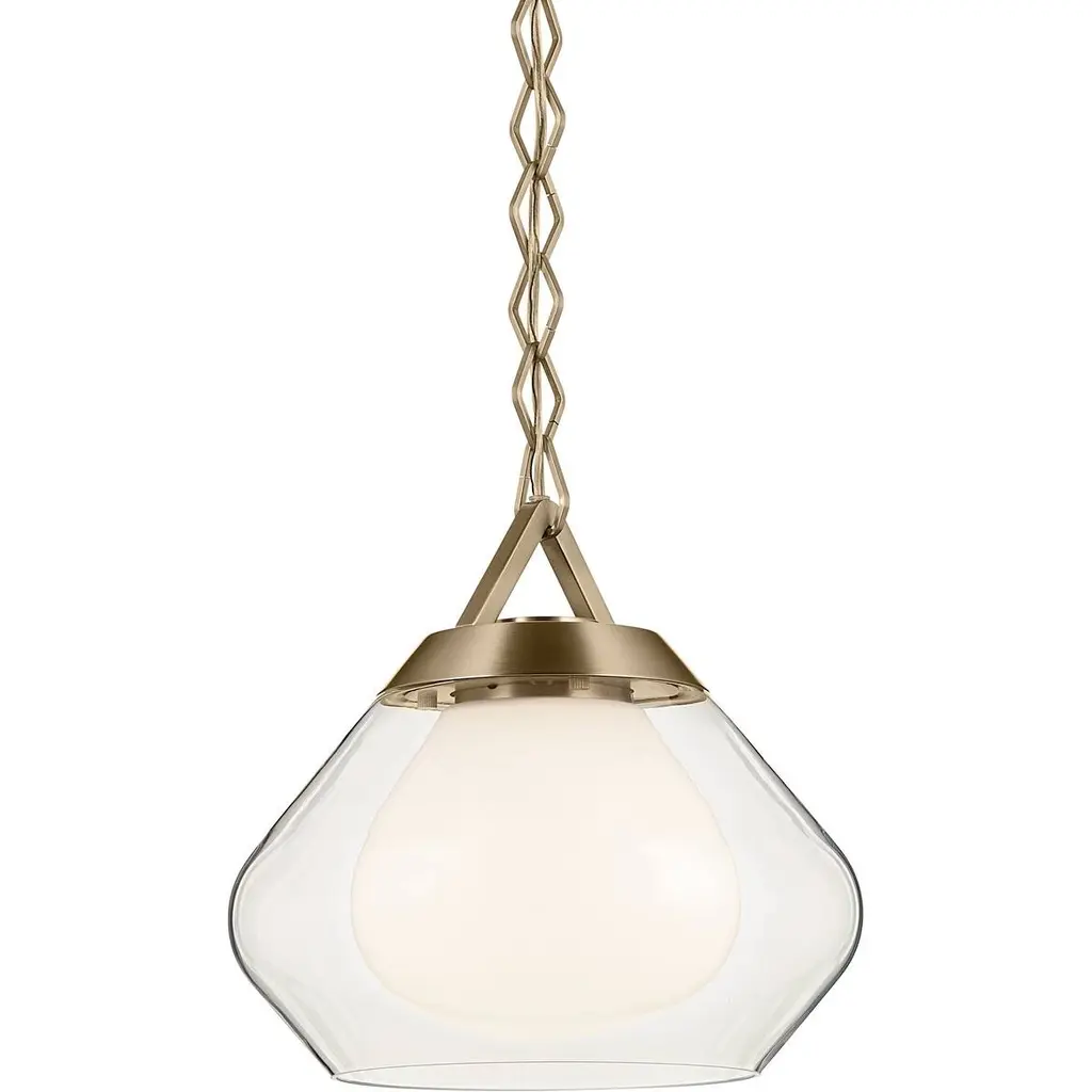 About the Nella 1-light pendant: captivates through its geometric shapes. The chain features diamond-shaped links, gracefully cascading down from the ceiling to reveal light encased in layered glass. This evolution of the popular globe shape has two glass layers. The outer later is clear glass, and the inner layer is cased opal glass. It comes together for a 1-light pendant unlike any other. Sloped ceiling compatible, hang it with the included adjustable chain.Features:Dimensions:Electrical Specifications: