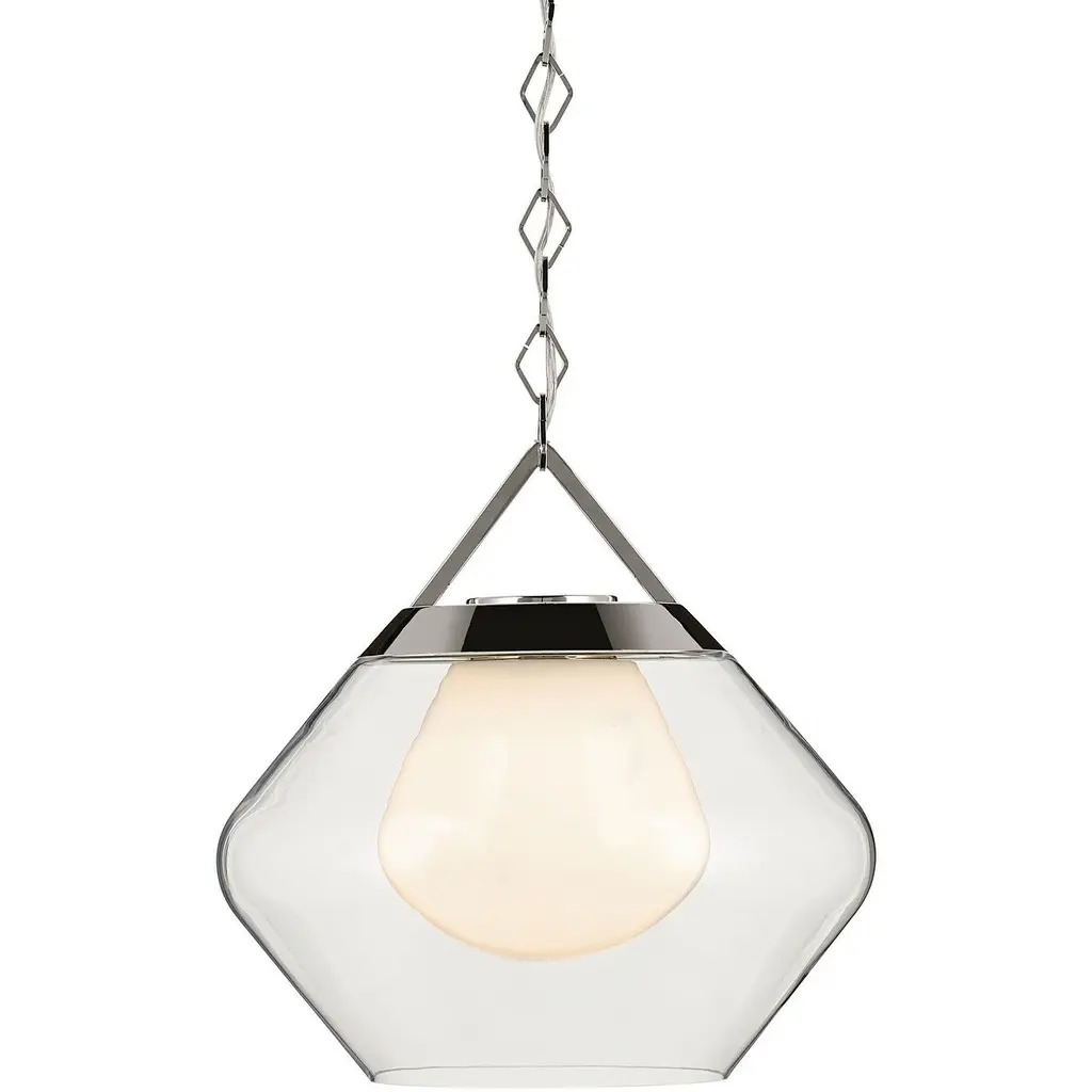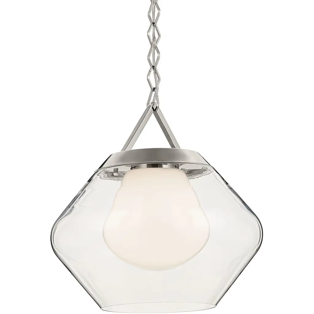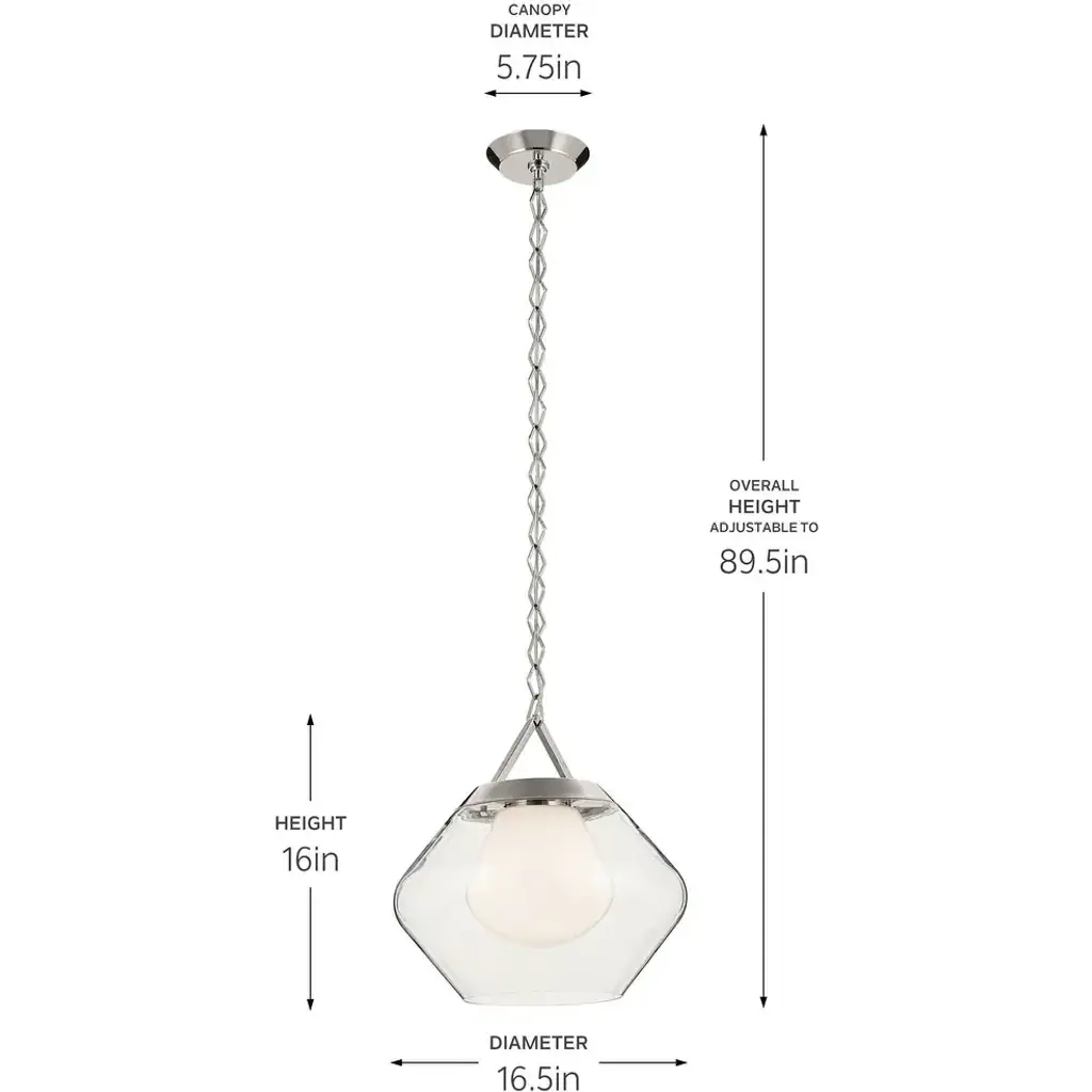 About the Nella 1-light pendant: captivates through its geometric shapes. The chain features diamond-shaped links, gracefully cascading down from the ceiling to reveal light encased in layered glass. This evolution of the popular globe shape has two glass layers. The outer later is clear glass, and the inner layer is cased opal glass. It comes together for a 1-light pendant unlike any other. Sloped ceiling compatible, hang it with the included adjustable chain.Features:Dimensions:Electrical Specifications: