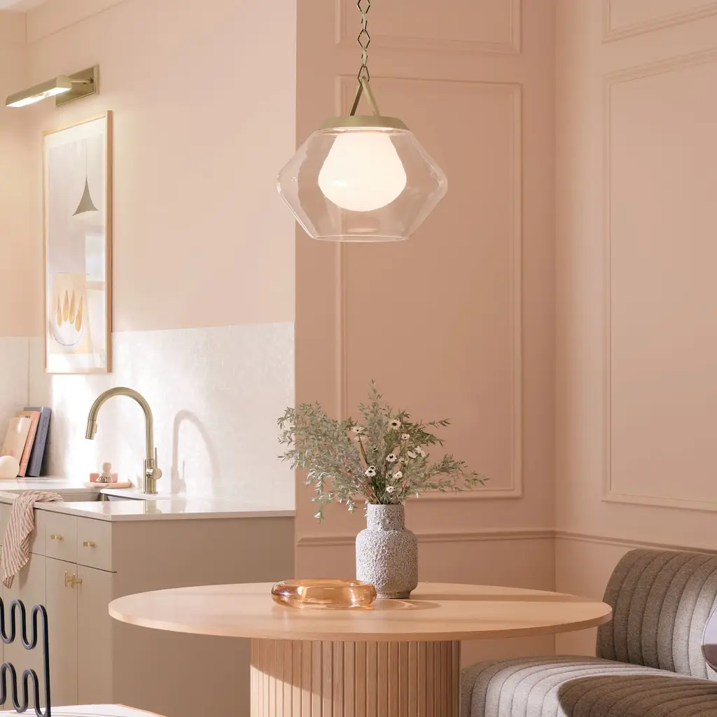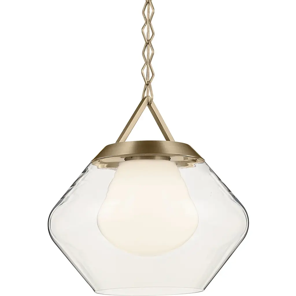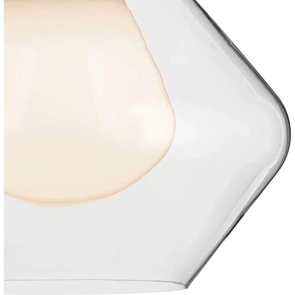 About the Nella 1-light pendant: captivates through its geometric shapes. The chain features diamond-shaped links, gracefully cascading down from the ceiling to reveal light encased in layered glass. This evolution of the popular globe shape has two glass layers. The outer later is clear glass, and the inner layer is cased opal glass. It comes together for a 1-light pendant unlike any other. Sloped ceiling compatible, hang it with the included adjustable chain.Features:Dimensions:Electrical Specifications: