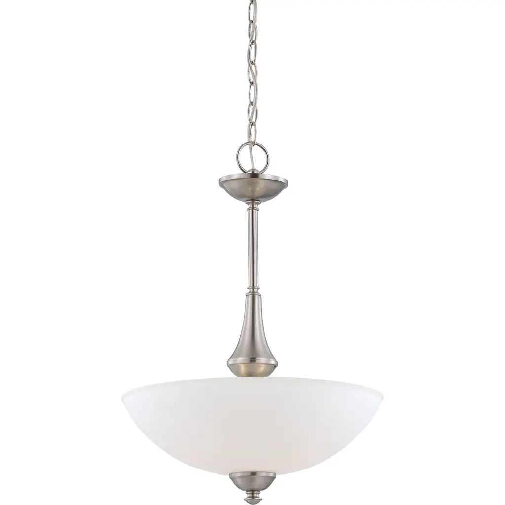 One Light Foyer Pendant from Nicholson collection in Brushed Nickel finish. Number of Bulbs 1. Max Wattage 150.00. No bulbs included. This tasteful 1 light foyer pendant from the Nicholson(TM) collection will make a refined statement in your home. Featuring an elegant, Brushed Nickel finish and Satin Etched Glass detailing, this design will complement a range of spaces. No UL Availability at this time.