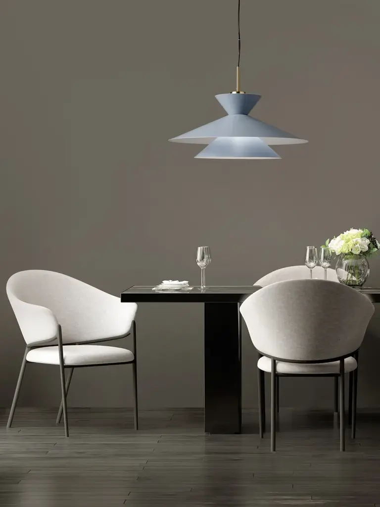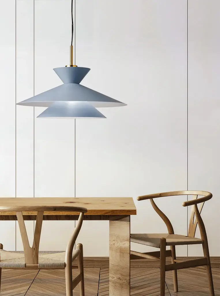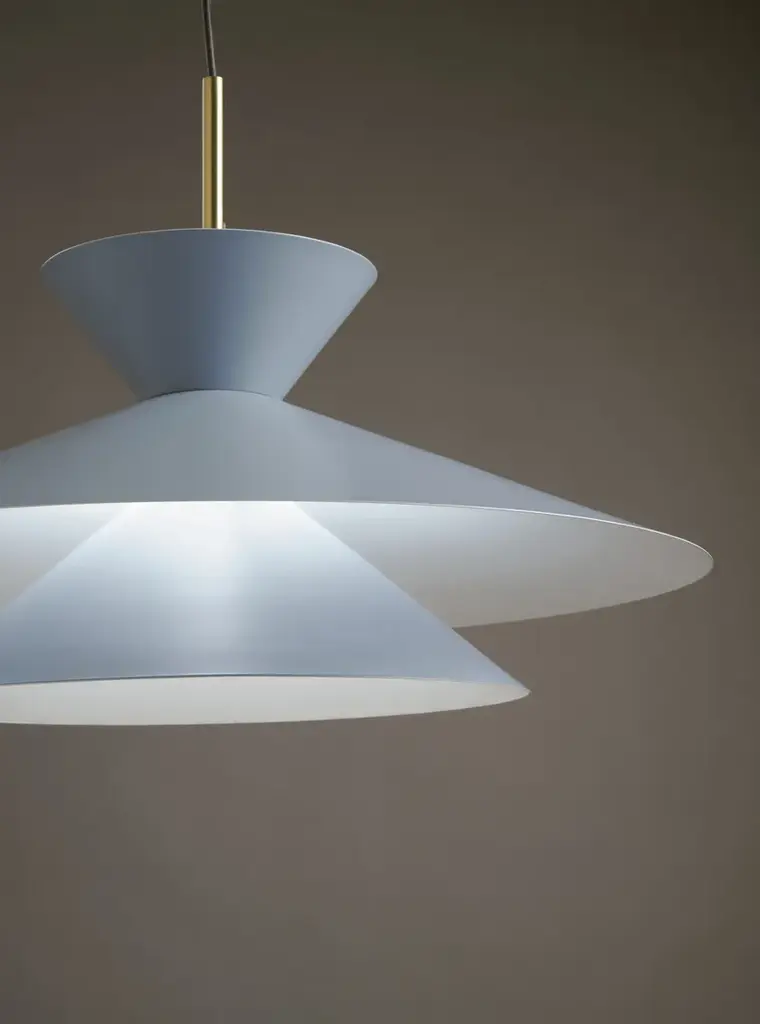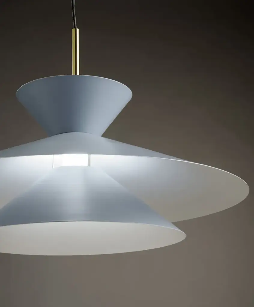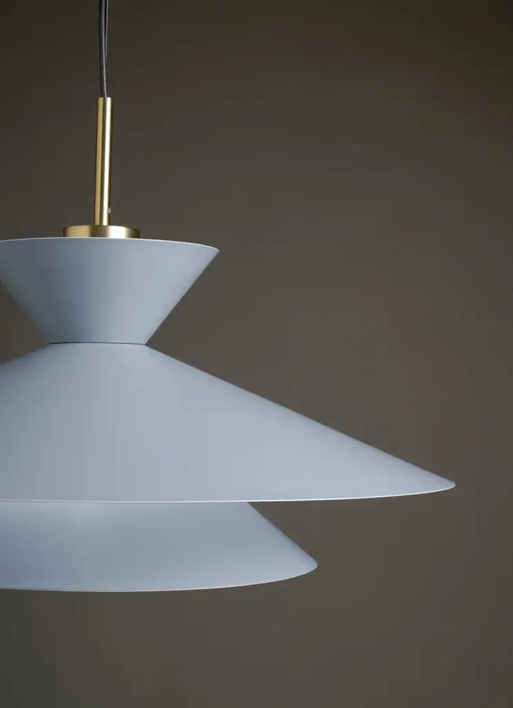 Kim is a suspension lamp made of sky blue painted metal and brushed brass support.Black 200 cm power supply cord.Sky blue rosette.Source E27 LEDPower 1 x max 20w