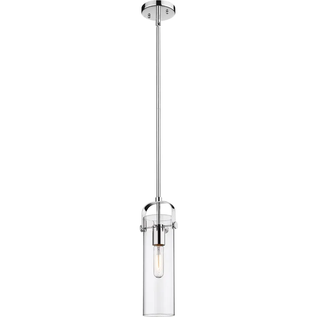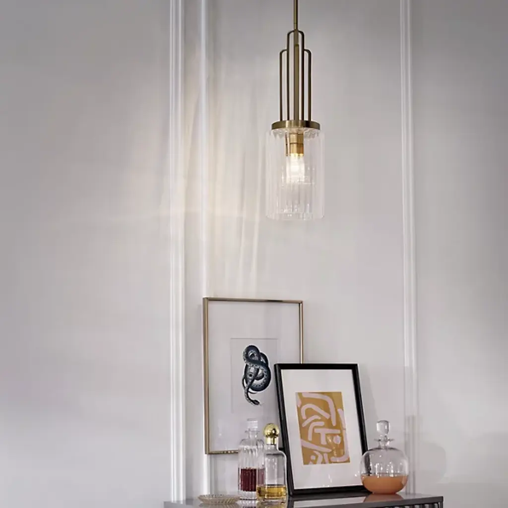 Art Deco delight. The Kimrose Mini Pendant from Kichler celebrates the early 20th century Deco movement with evocative accents, fitting for the refined home aesthetic. As a mini pendant, the piece provides instant versatility, factoring perfectly on its own or arranged in a series. It reveals its Deco personality with tall metal accents arching over the top. The dashing lines of the accents repeat themselves in the subtle and elegant ribbed glass shade. The clear glass shade provides a shimmering note that enhances the warm light radiating through it.