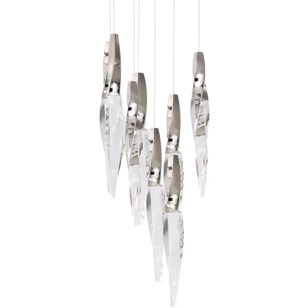 A subtle twist of luxe. Kindjal is an exquisite optic crystal dagger that twists to a point from a cohesive metal fitting that conceals a powerful LED that provides ample downlighting. Stylish, textured materiality. Schonbek Beyond LED luminaires feature a 3-CCT color temperature selectable switch that can be accessed at the time of installation to toggle between 3000K-3500K-4000K color temperatures. Kindjal is offered in multi-light (3 Light, 5 Light, 9 Light, 15 Light, and 21 Light) or single light configurations. Ultra-sleek electrified cables eliminate the need for clunky power wires and the height is simple to adjust through push pin connectors on the canopy up to 10ft of length. Kindjal is offered with a matching bathroom vanity light or wall sconce.