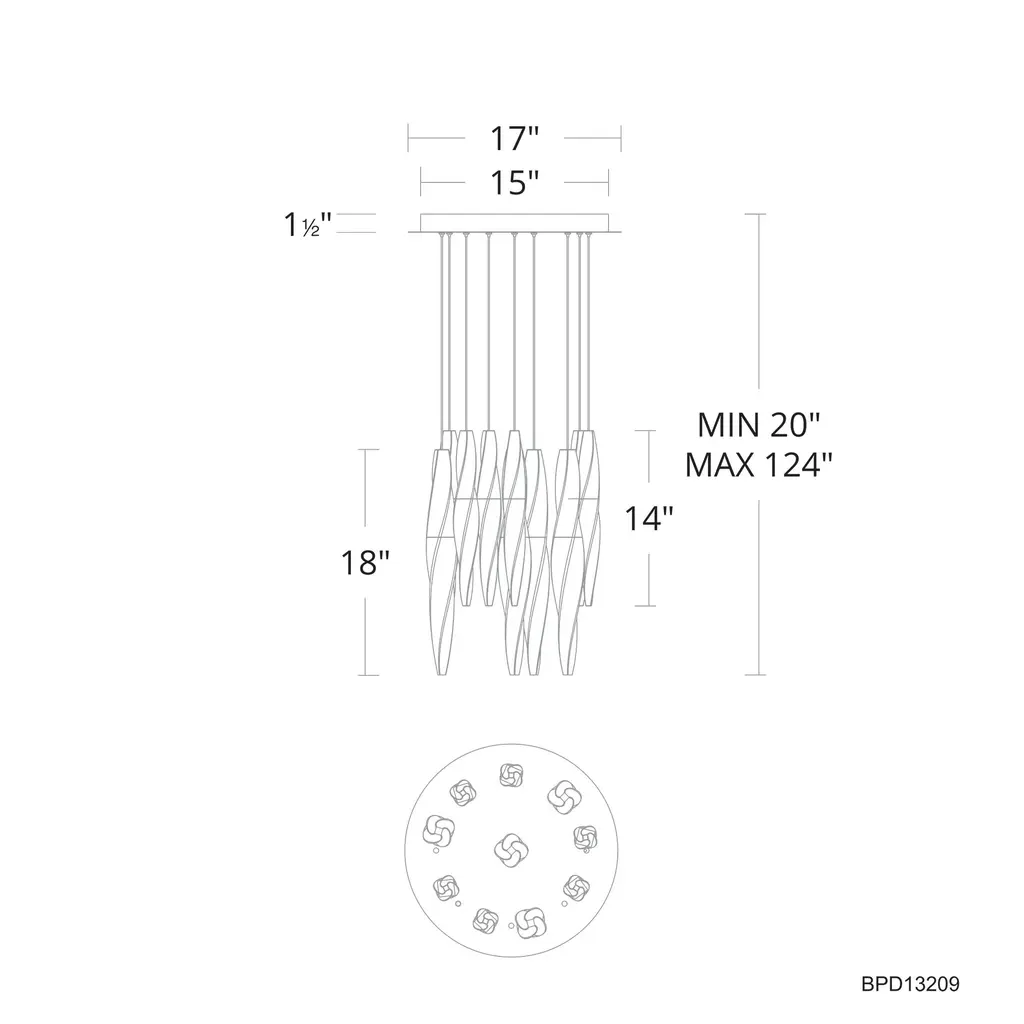 A subtle twist of luxe. Kindjal is an exquisite optic crystal dagger that twists to a point from a cohesive metal fitting that conceals a powerful LED that provides ample downlighting. Stylish, textured materiality. Schonbek Beyond LED luminaires feature a 3-CCT color temperature selectable switch that can be accessed at the time of installation to toggle between 3000K-3500K-4000K color temperatures. Kindjal is offered in multi-light (3 Light, 5 Light, 9 Light, 15 Light, and 21 Light) or single light configurations. Ultra-sleek electrified cables eliminate the need for clunky power wires and the height is simple to adjust through push pin connectors on the canopy up to 10ft of length. Kindjal is offered with a matching bathroom vanity light or wall sconce.