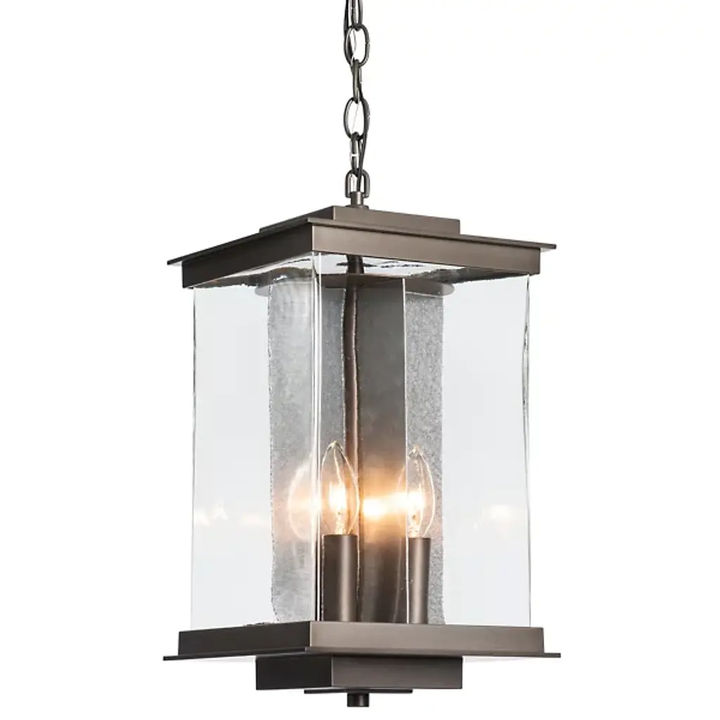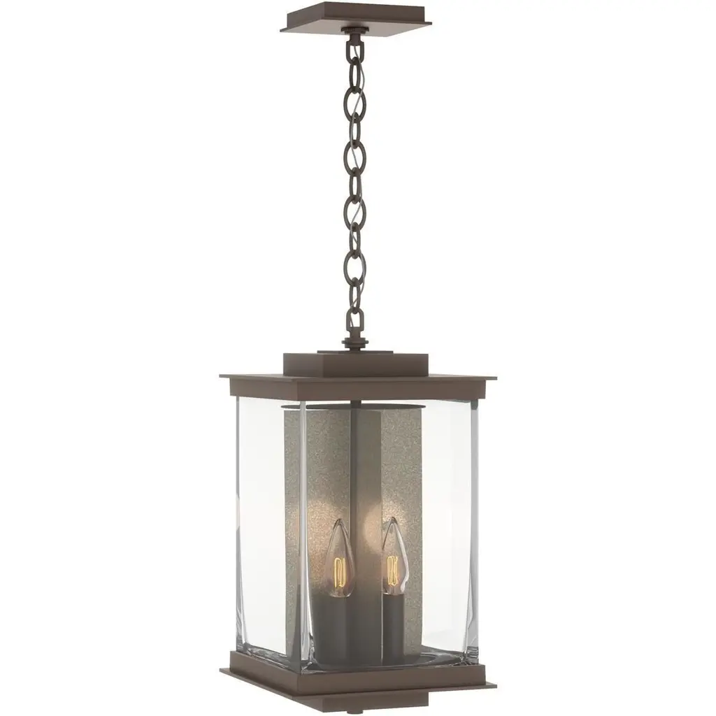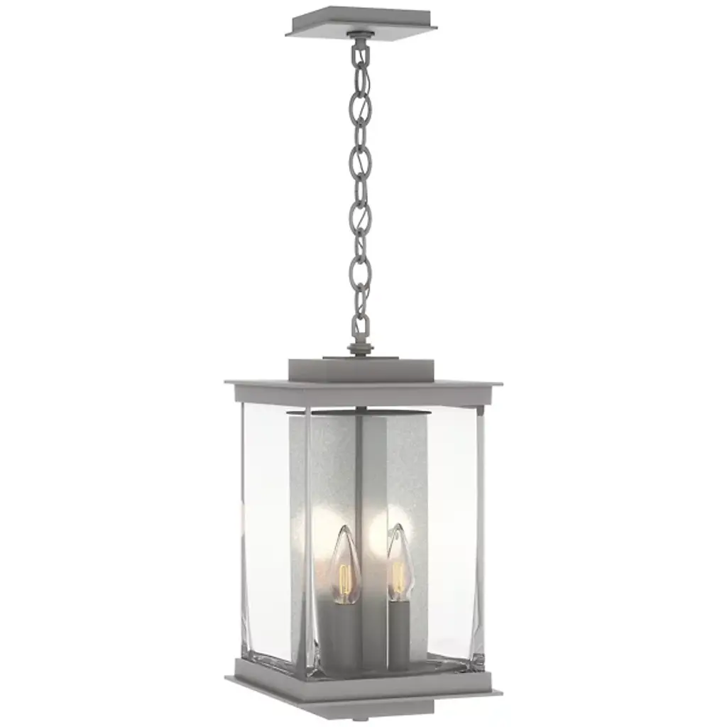 Lay claim to your outside spaces at any time of night with the smooth elegance of the Kingston Outdoor Pendant from Hubbardton Forge. Mountable at up to a 45-degree incline, a smooth square canopy secures the fixture, sending down a robust chain and interwoven power cable down to a candelabra-style structure below. Handcrafted to order, each piece arrives with the proprietary Coastal Outdoor finish for added durability, while a rectangular shade of painstakingly-produced clear blown glass surrounds the lamping, accented by stepped square caps at each end that echo the canopy. Finally, each socket is backed and subdivided from the others by a textured accent plate that brings reflected warmth to the fixture’s wide-reaching and even ambiance.