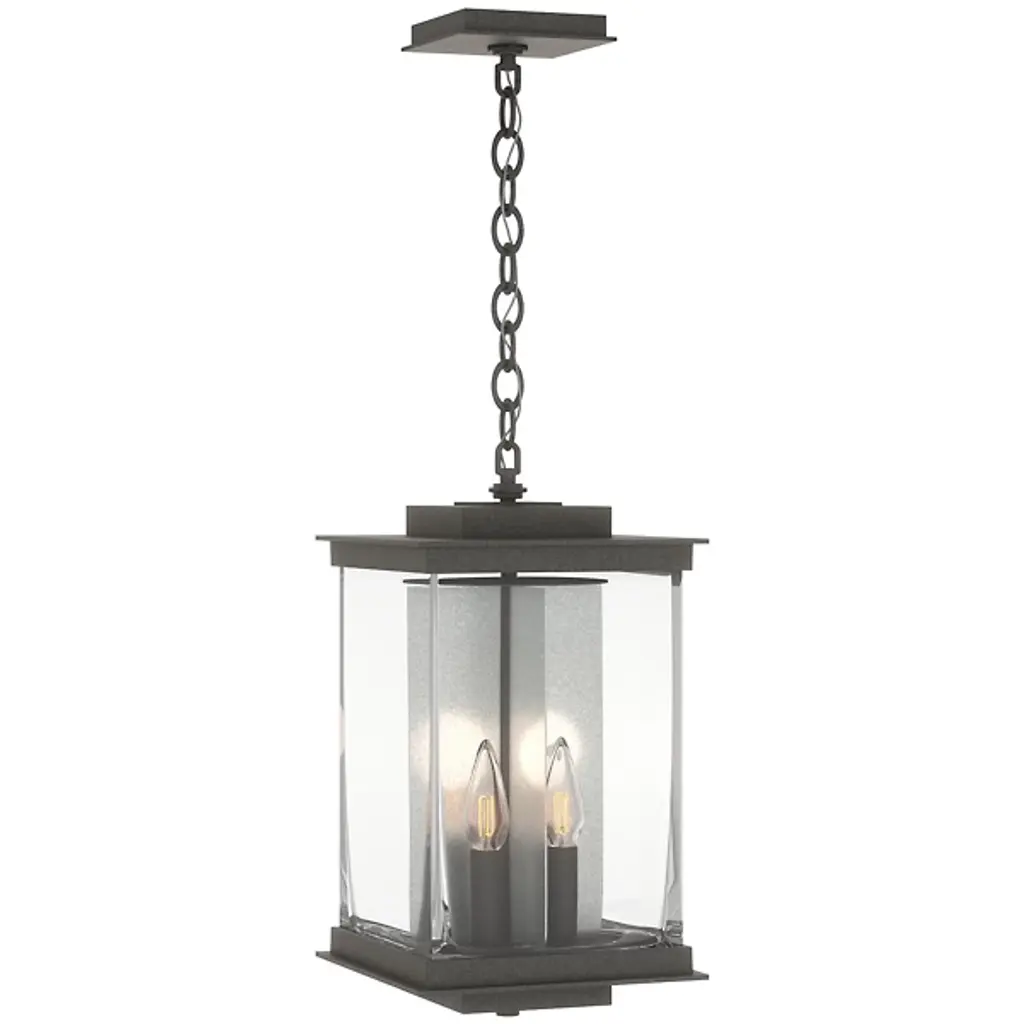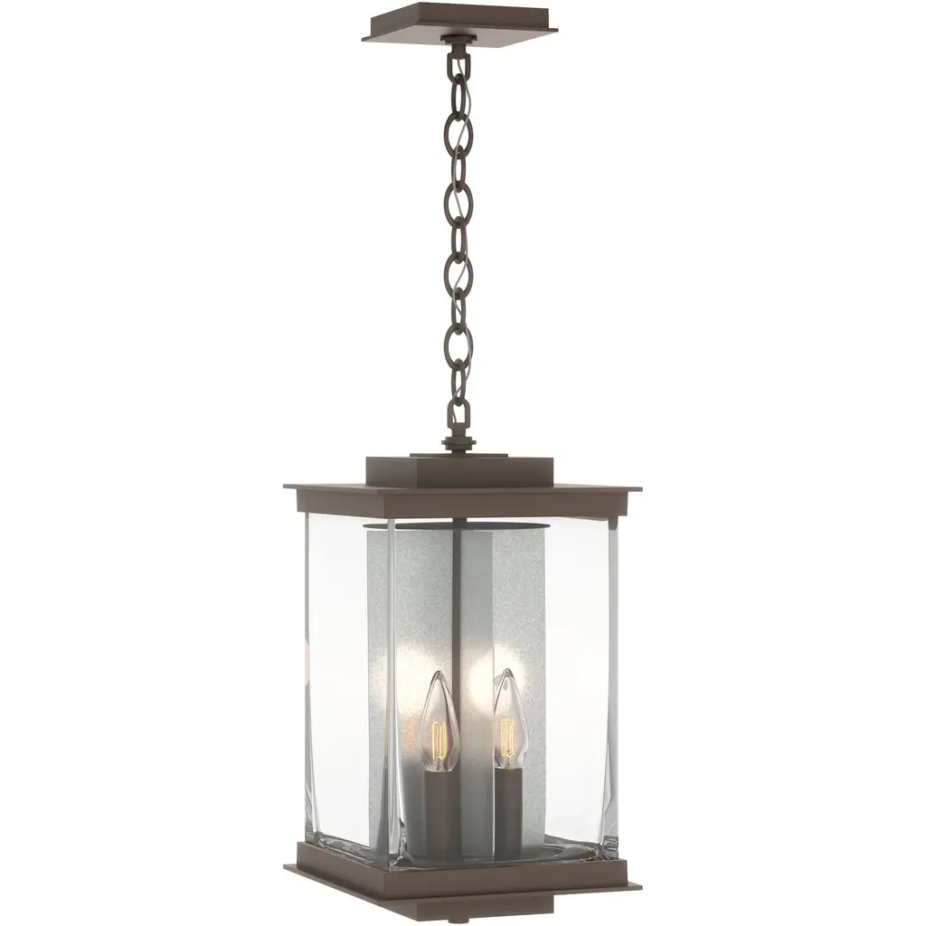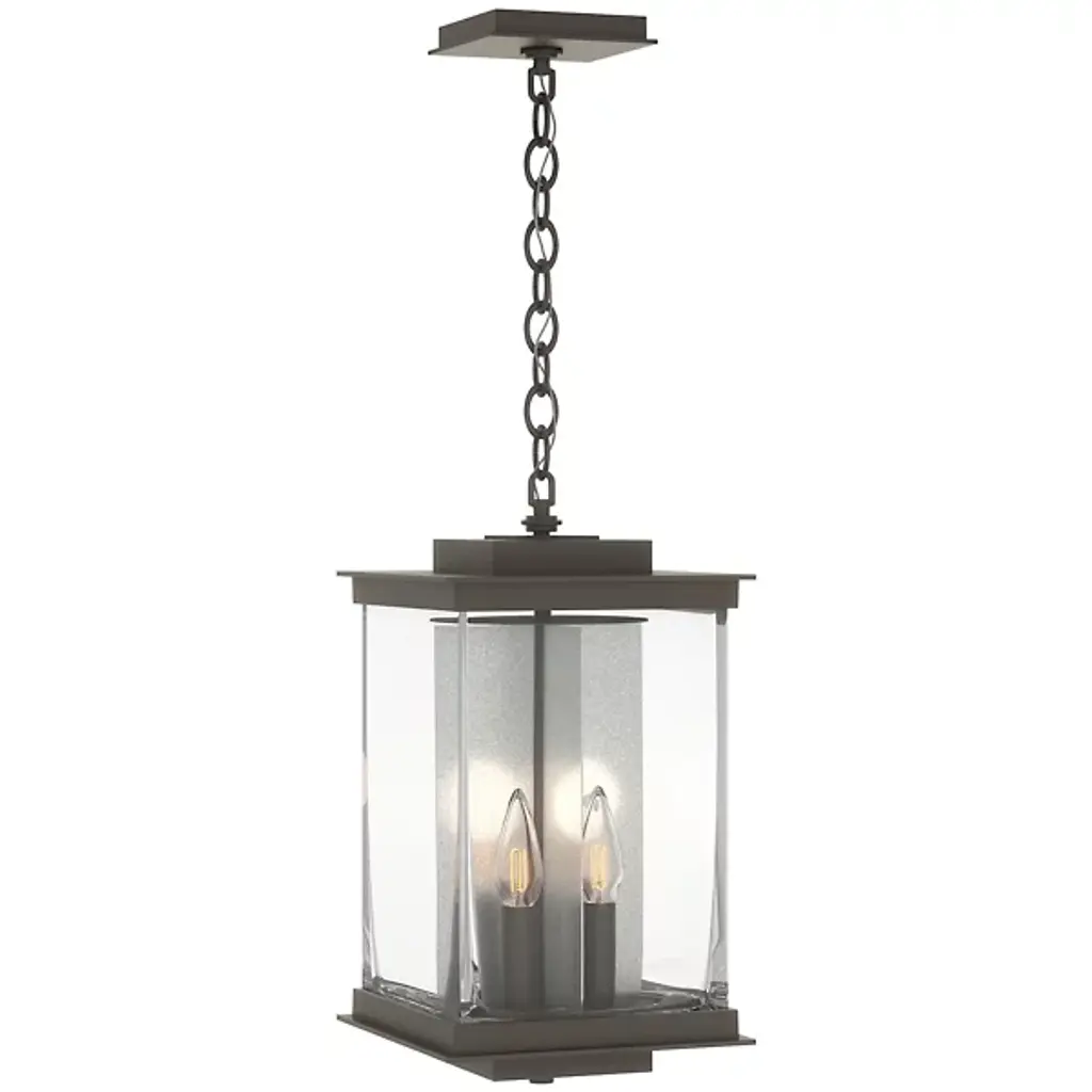 Lay claim to your outside spaces at any time of night with the smooth elegance of the Kingston Outdoor Pendant from Hubbardton Forge. Mountable at up to a 45-degree incline, a smooth square canopy secures the fixture, sending down a robust chain and interwoven power cable down to a candelabra-style structure below. Handcrafted to order, each piece arrives with the proprietary Coastal Outdoor finish for added durability, while a rectangular shade of painstakingly-produced clear blown glass surrounds the lamping, accented by stepped square caps at each end that echo the canopy. Finally, each socket is backed and subdivided from the others by a textured accent plate that brings reflected warmth to the fixture’s wide-reaching and even ambiance.