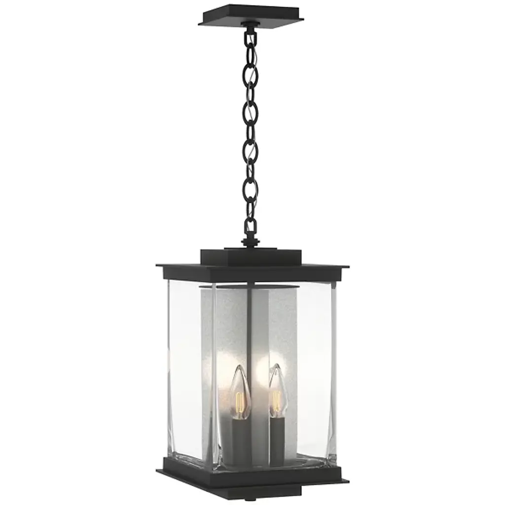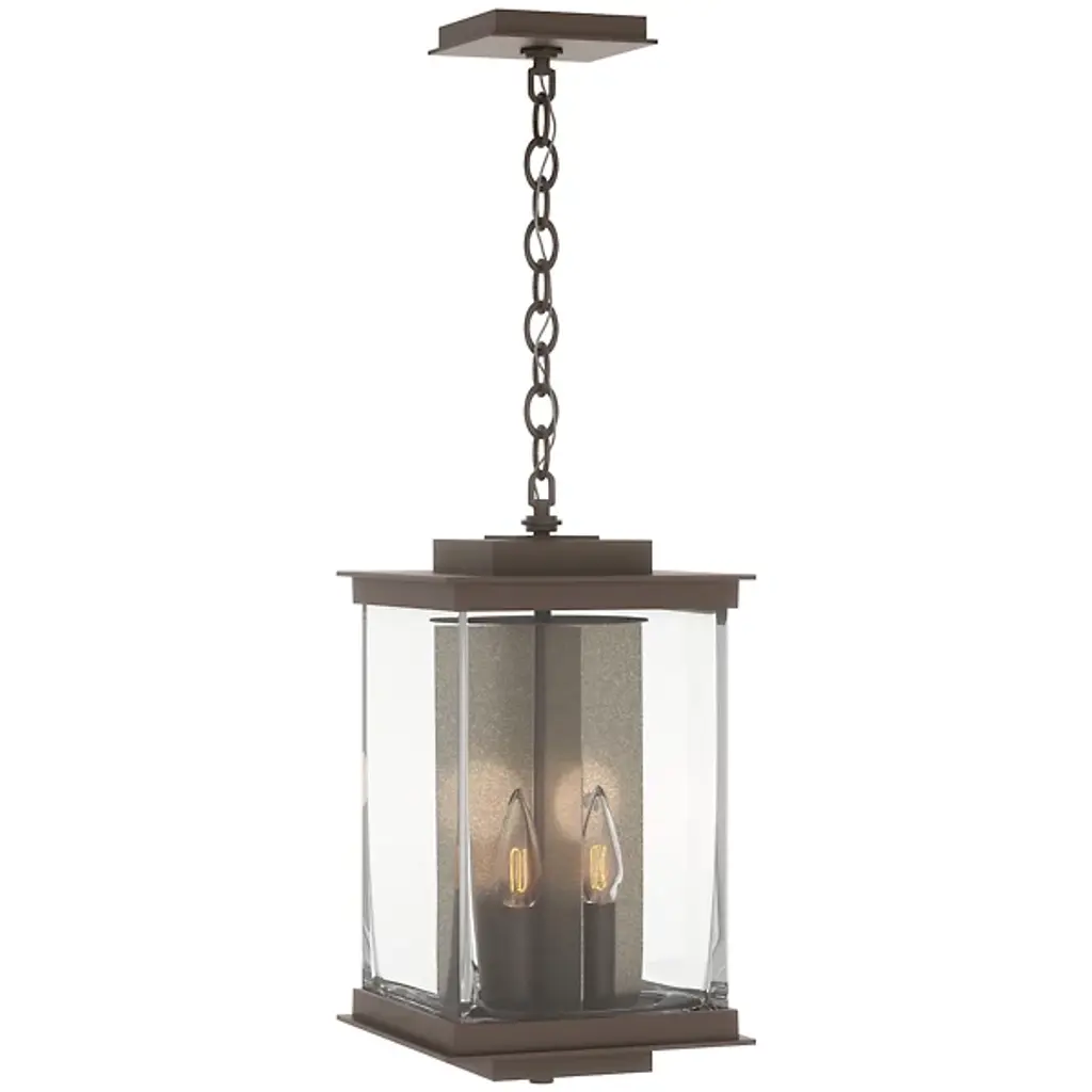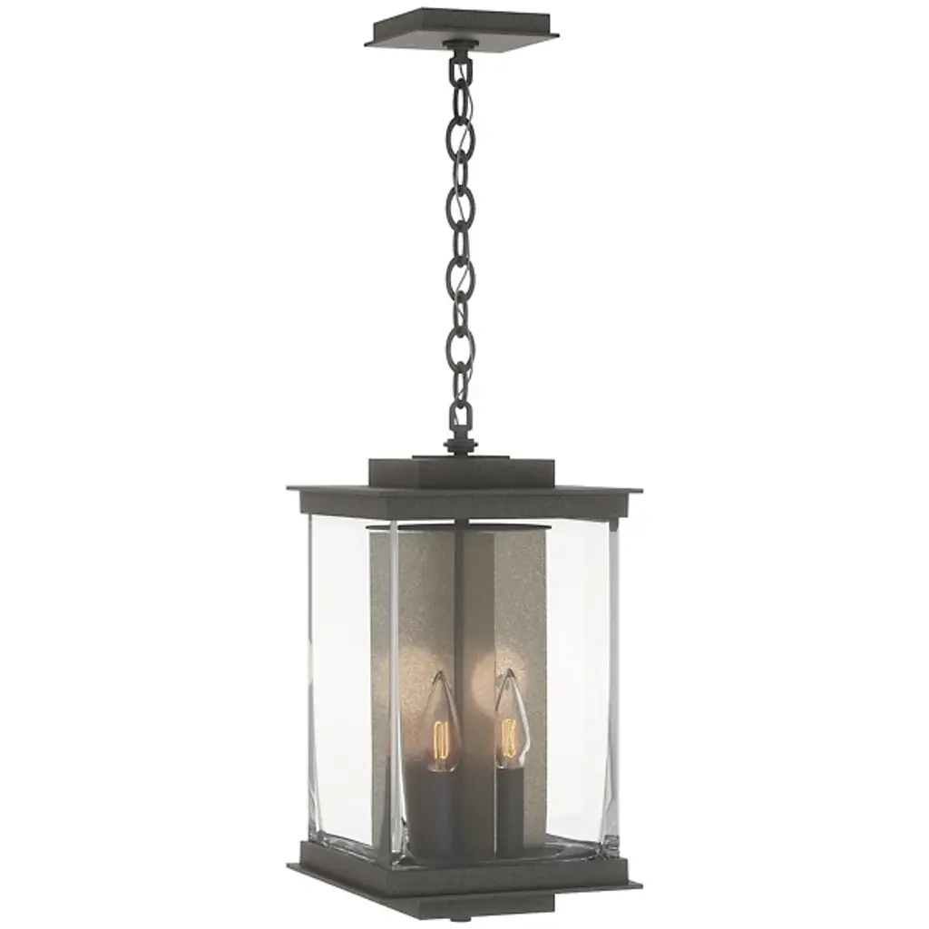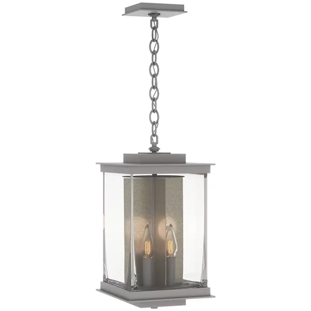 Lay claim to your outside spaces at any time of night with the smooth elegance of the Kingston Outdoor Pendant from Hubbardton Forge. Mountable at up to a 45-degree incline, a smooth square canopy secures the fixture, sending down a robust chain and interwoven power cable down to a candelabra-style structure below. Handcrafted to order, each piece arrives with the proprietary Coastal Outdoor finish for added durability, while a rectangular shade of painstakingly-produced clear blown glass surrounds the lamping, accented by stepped square caps at each end that echo the canopy. Finally, each socket is backed and subdivided from the others by a textured accent plate that brings reflected warmth to the fixture’s wide-reaching and even ambiance.