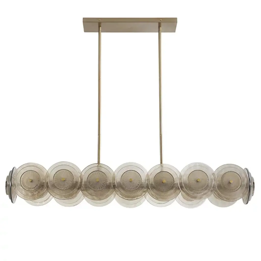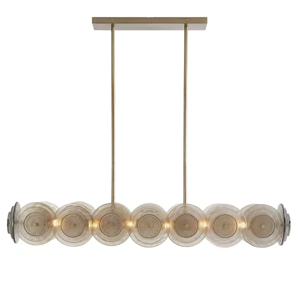Delight in the art deco style of the Kinlee Linear Suspension by Arteriors. Downrods stem from a rectangular ceiling canopy to give support to a well-worked Hammered Iron frame. Fine plate-like shades of etched glass line the suspension’s metal frame, giving space for numerous incandescent bulbs to project light. With a hanging light fixture, rest assured that your in-home setting will be sufficiently illuminated from overhead. Place this decorative furnishment over your kitchen island and ensure mealtime preparation is hassle-free.