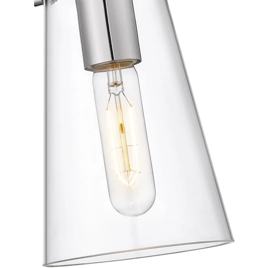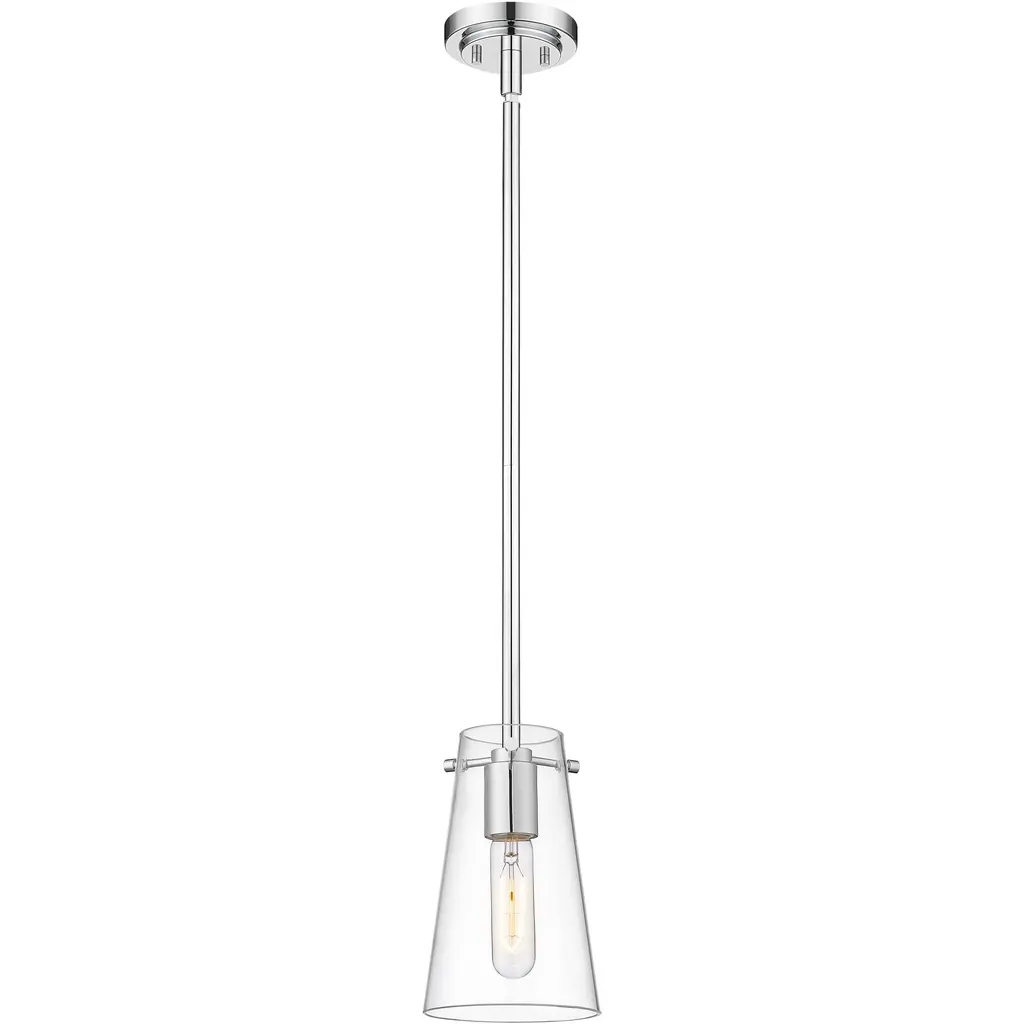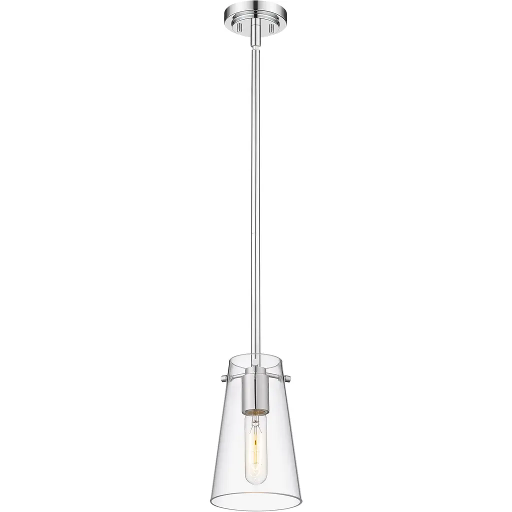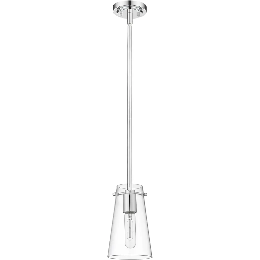 Infused with modern appeal, this one-light pendant pairs a chic chrome finish with a minimalist silhouette that clears the way for beautiful illumination. A conical shade of clear glass refracts light for bright lighting over a kitchen island or in your living area. Its simplicity is a highlight, perfect for a contemporary space that embraces understated refinement.