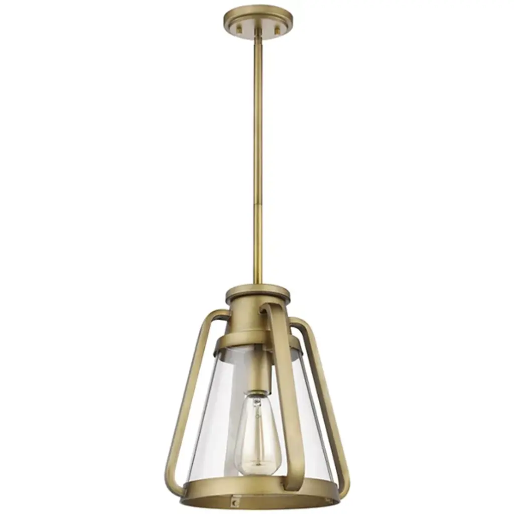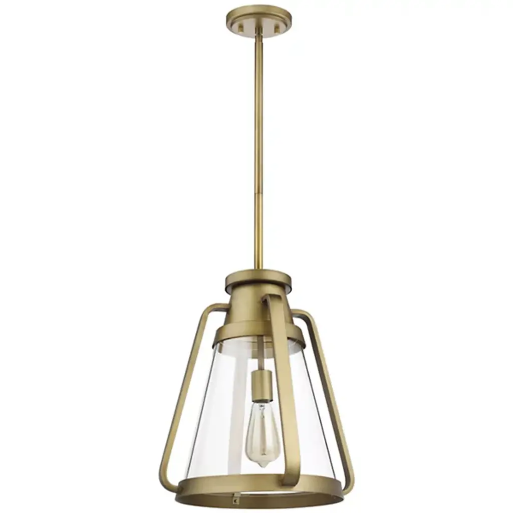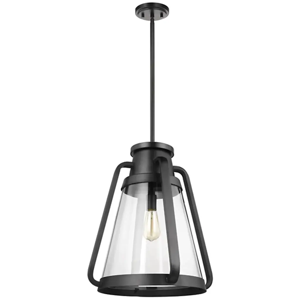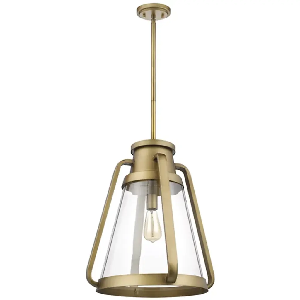 Make an elegant addition to indoor ceilings with the Kirk Pendant from Alder & Ore. Retained from above by a stepped disc canopy, it extends a sleek central stem to a candelabra lamp below, held within a lanternlike shade of clear conical glass surrounded by a smooth steel structure with bracket accents. This contrast of glass and brushed metal extends a radiant pool of light below the fixture, while the shade mellows glare into a glow that glitters off the metal.