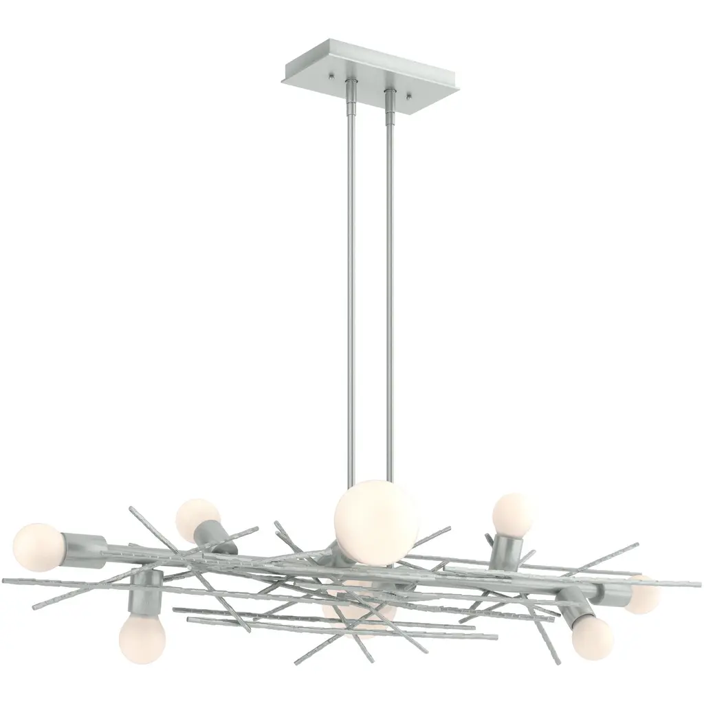 The Kiwi Pendant by Hubbardton Forge uses the weight of heavy hand-blown glass to balance six mini pendants over a set of steel branches, melding symmetry and nature as they were meant to be. Unique socket details ensure evocation of intrigue and awe. Thick glass distributes ambient light to the room while creating beautiful refractions and light play.
