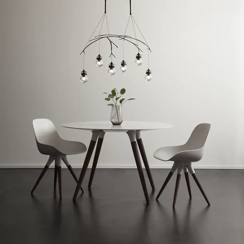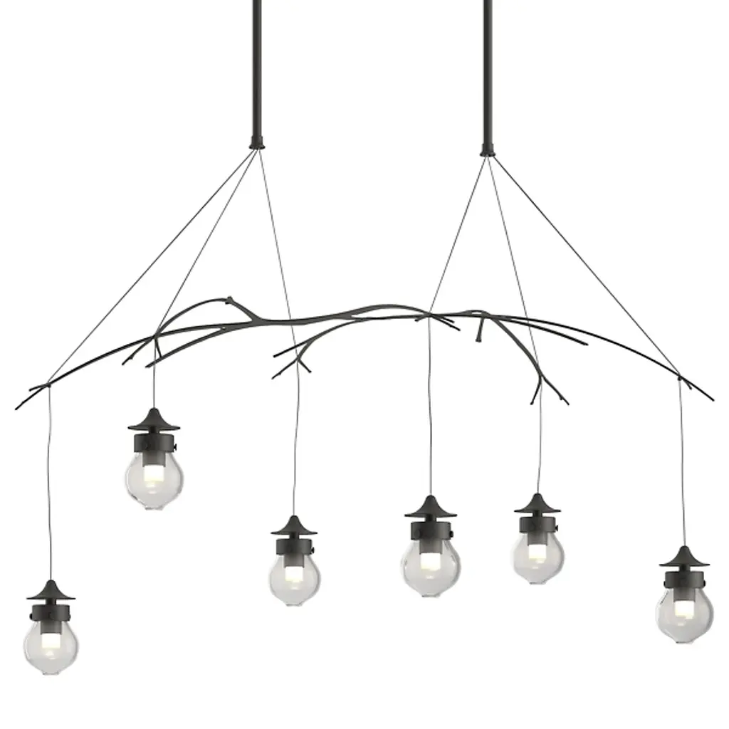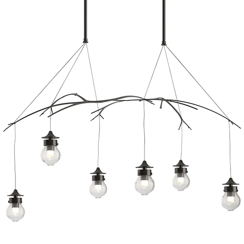 The Kiwi Pendant by Hubbardton Forge uses the weight of heavy hand-blown glass to balance six mini pendants over a set of steel branches, melding symmetry and nature as they were meant to be. Unique socket details ensure evocation of intrigue and awe. Thick glass distributes ambient light to the room while creating beautiful refractions and light play.