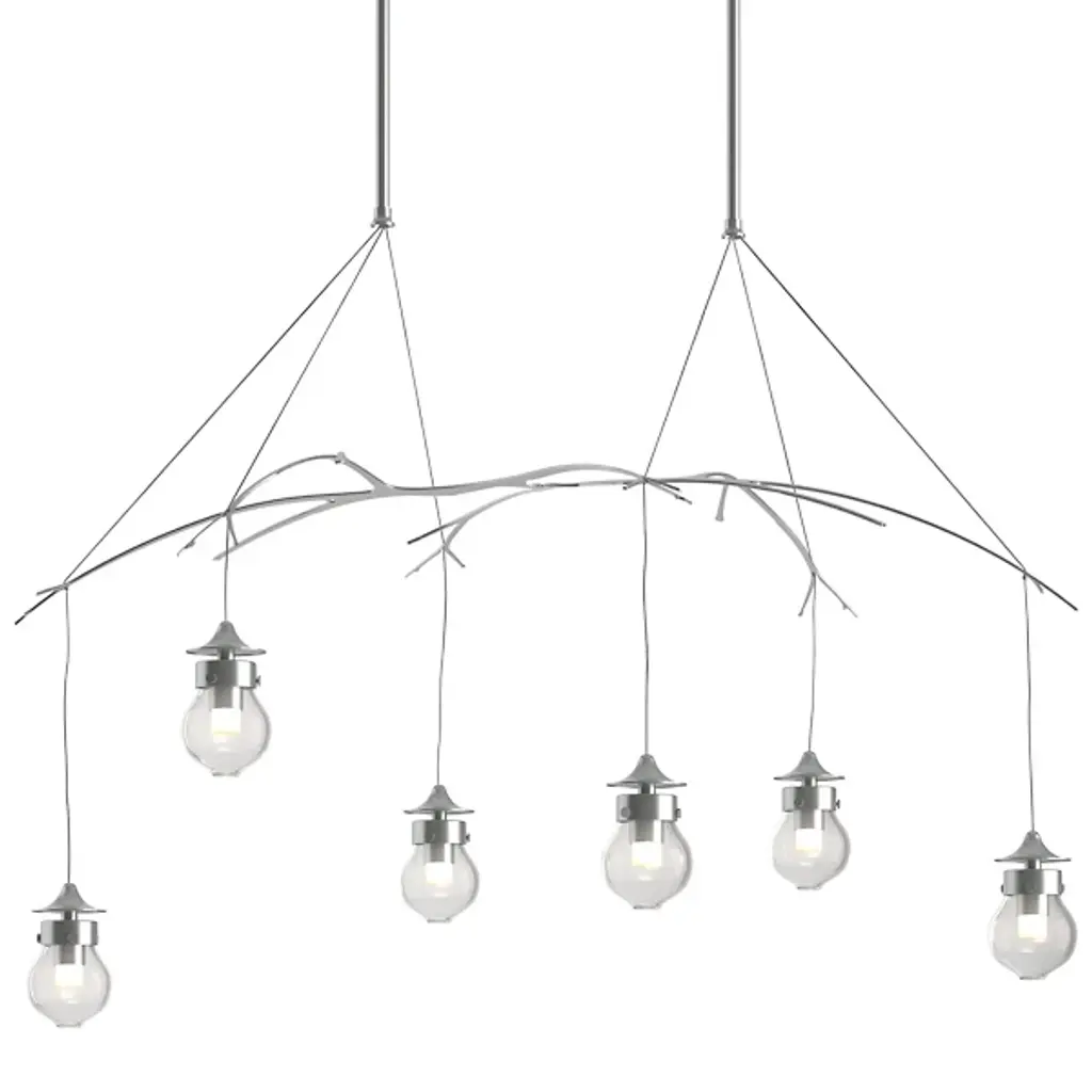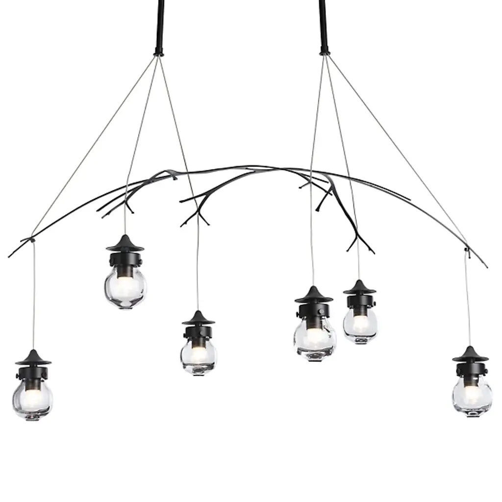 The Kiwi Pendant by Hubbardton Forge uses the weight of heavy hand-blown glass to balance six mini pendants over a set of steel branches, melding symmetry and nature as they were meant to be. Unique socket details ensure evocation of intrigue and awe. Thick glass distributes ambient light to the room while creating beautiful refractions and light play.