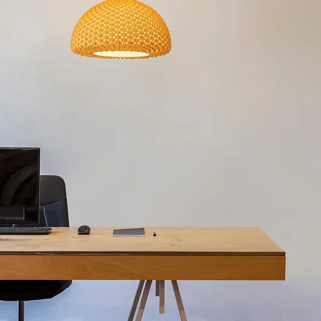 The Knitted Dome Pendant from Ariel Zuckerman blends technology with tradition by combining industrially knitted acrylic threads with handcrafted wool crochet details for one award-winning design. It features a three-dimensional textile that wraps around a rigid frame, forming a light fixture with organic character and vibrant color. The texture and artisanal design bring warmth and depth, handing elegantly to add a bold splash of color to your home decor.