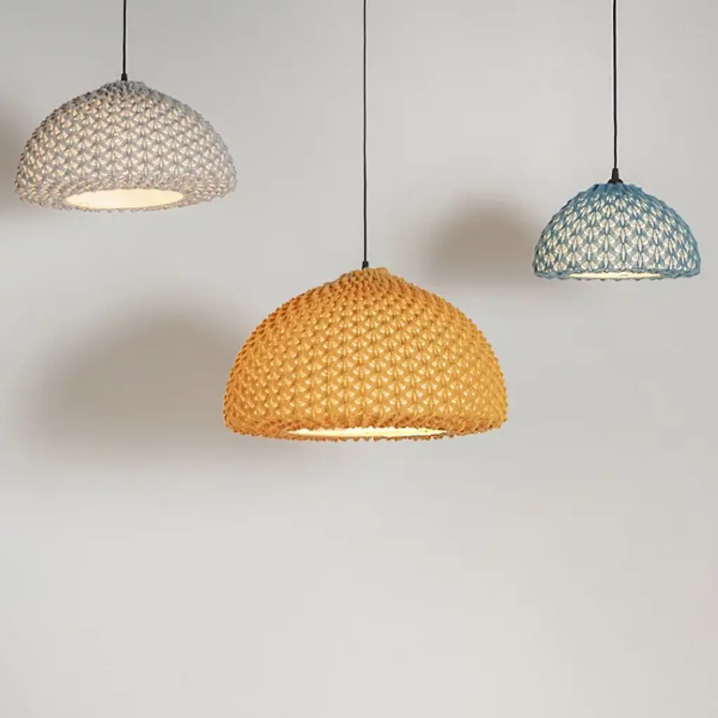 The Knitted Dome Pendant from Ariel Zuckerman blends technology with tradition by combining industrially knitted acrylic threads with handcrafted wool crochet details for one award-winning design. It features a three-dimensional textile that wraps around a rigid frame, forming a light fixture with organic character and vibrant color. The texture and artisanal design bring warmth and depth, handing elegantly to add a bold splash of color to your home decor.