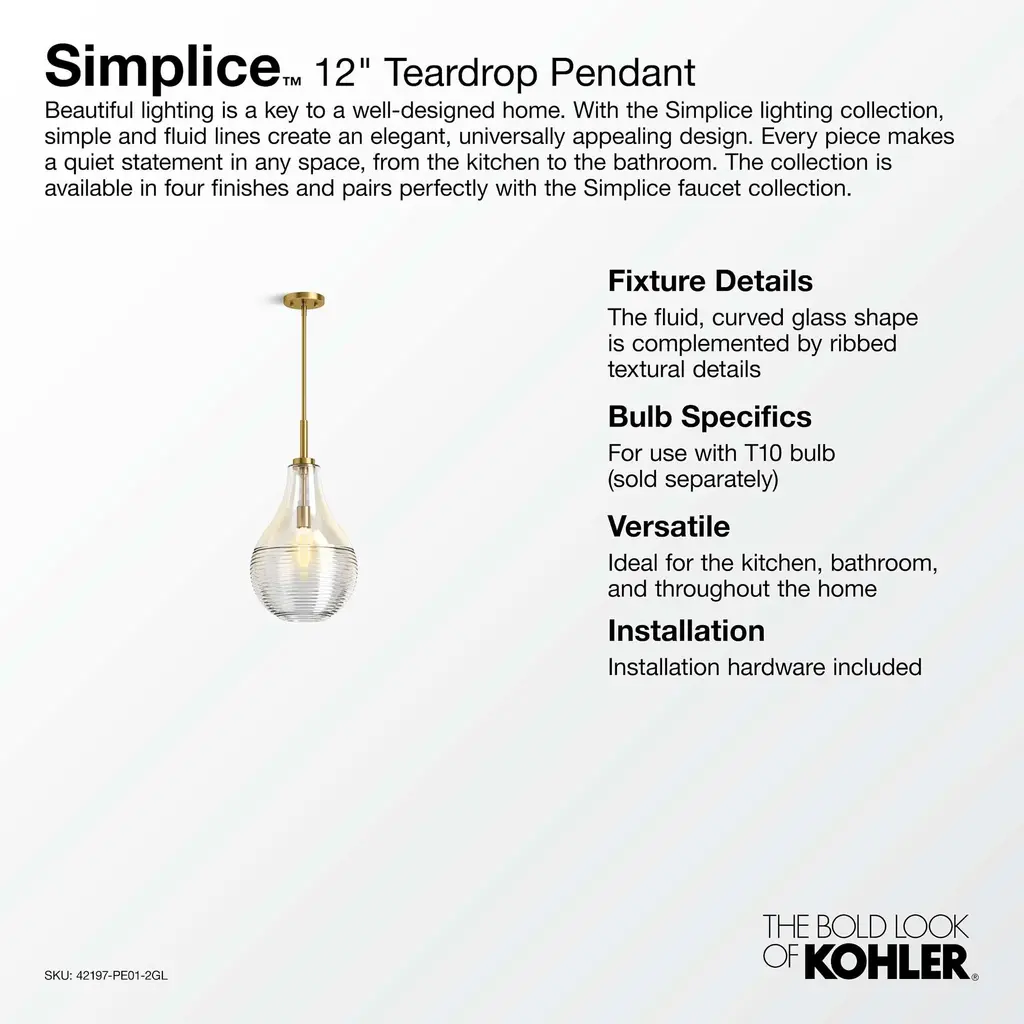 With an elegant, universal design, the Simplice lighting collection speaks a chic design language that everyone can understand. Simplice lighting fixtures will provide the finishing touch to any area of your home and are available in a variety of finishes. The teardrop-shaped clear glass shade is delicately accentuated with an elegant ripple design along the bottom half. At Kohler, we make it our business to help you create the home of your dreams.Features:Dimensions:Electrical Specifications: