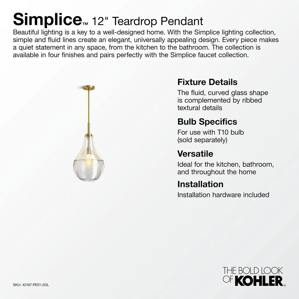 With an elegant, universal design, the Simplice lighting collection speaks a chic design language that everyone can understand. Simplice lighting fixtures will provide the finishing touch to any area of your home and are available in a variety of finishes. The teardrop-shaped clear glass shade is delicately accentuated with an elegant ripple design along the bottom half. At Kohler, we make it our business to help you create the home of your dreams.Features:Dimensions:Electrical Specifications: