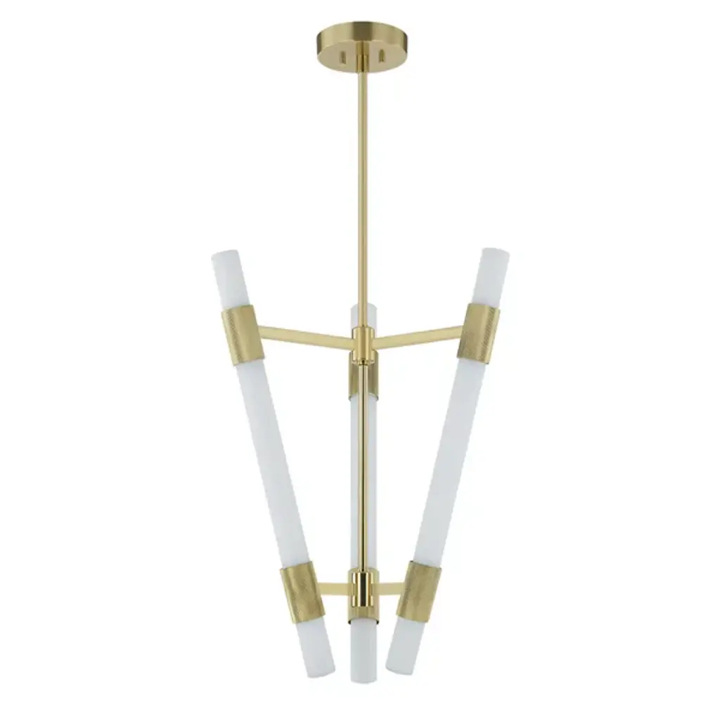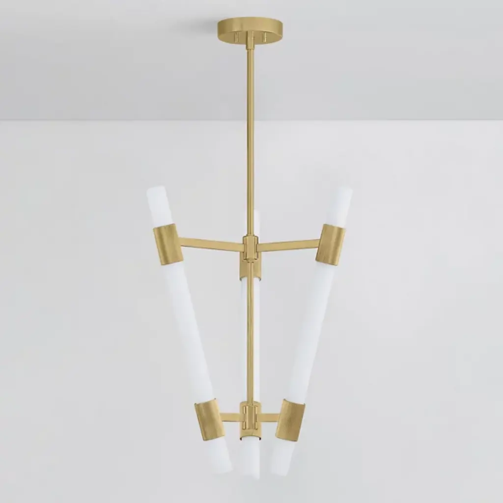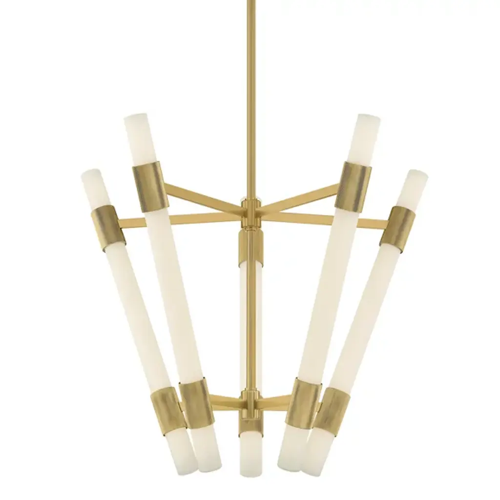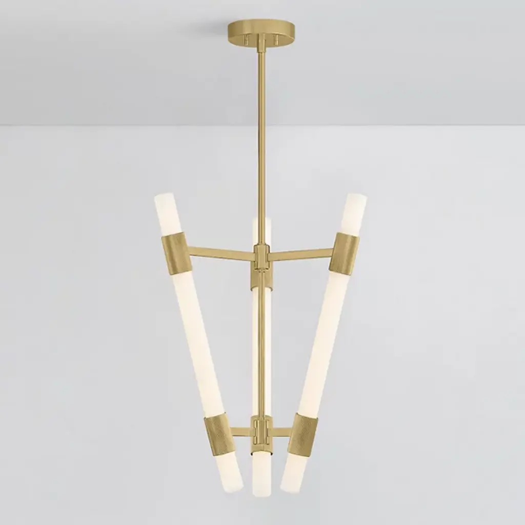 The Krakow LED Pendant from Corbett Lighting incorporates glass tubes that extend outward from the center at precise angles, creating an unexpected arrangement that plays with perception. Brass cuffs grip each tube firmly while adding textural interest through their ribbed detailing. Inside the suspension, LED technology provides ample illumination that travels through the glass tubes and into your space. As light radiates in multiple directions, rooms feel brighter without any harsh glare. This pendant works especially well in open areas where its unconventional form can be viewed and appreciated from different perspectives.