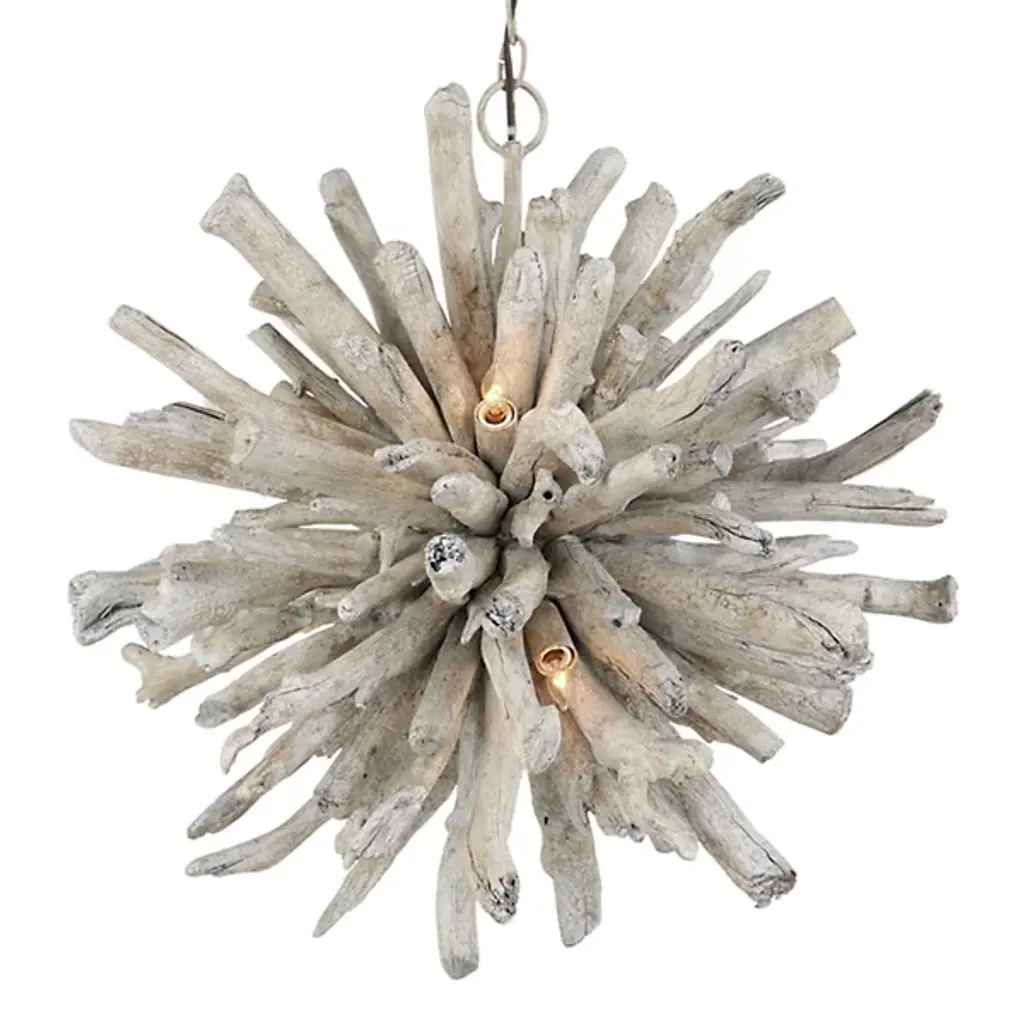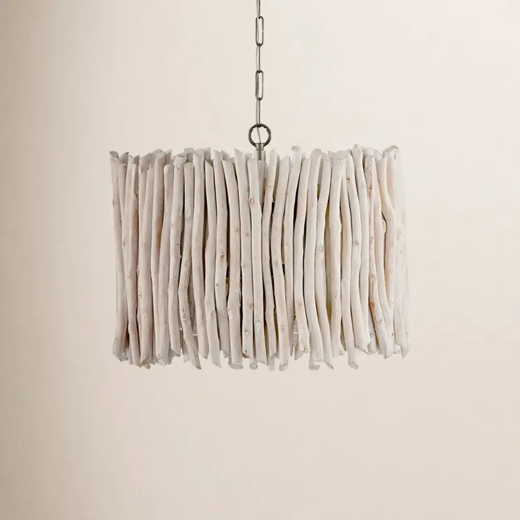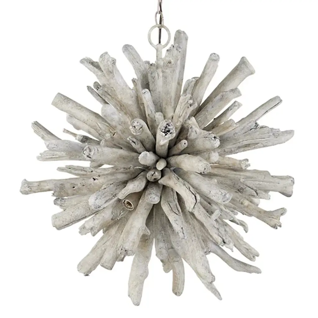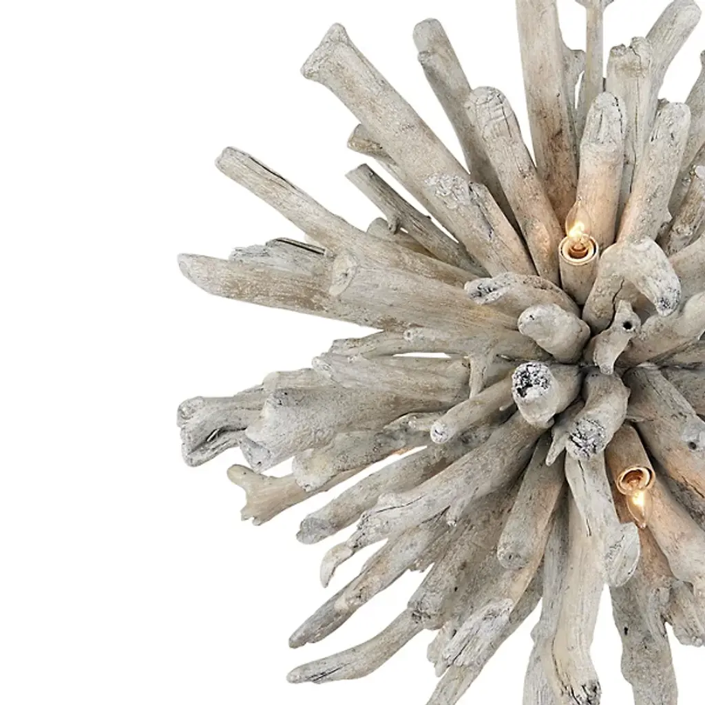 The Kuka Pendant from Currey & Company is a captivating design by Marjorie Skouras. Resembling a whitewashed driftwood starburst, this pendant is a celebration of the Yucatan Peninsula, Skouras' home. Tumbled wood pieces, meticulously arranged on the frame, create a nature-inspired profile that seamlessly appears as if it emerged as one. The Kuka Pendant, with its natural tones and organic design, is an ideal choice for coastal settings and lakeside retreats, bringing a touch of nature indoors.