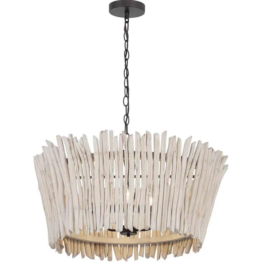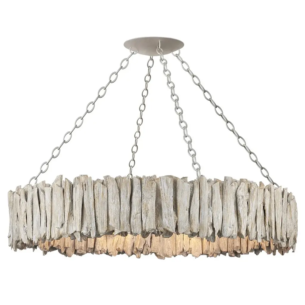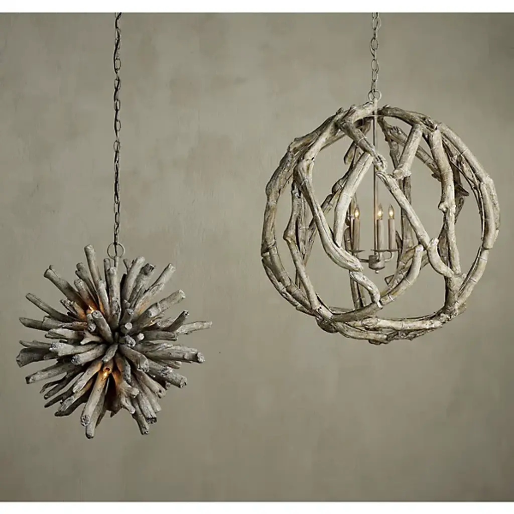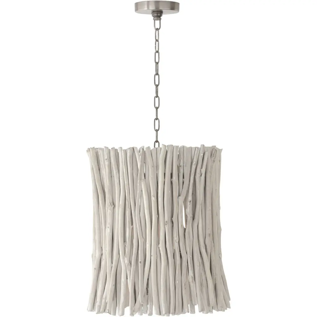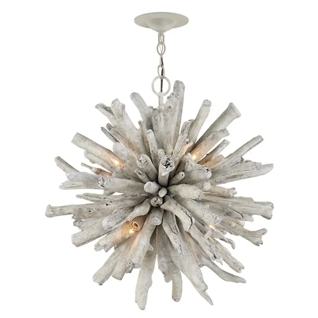 The Kuka Pendant from Currey & Company is a captivating design by Marjorie Skouras. Resembling a whitewashed driftwood starburst, this pendant is a celebration of the Yucatan Peninsula, Skouras' home. Tumbled wood pieces, meticulously arranged on the frame, create a nature-inspired profile that seamlessly appears as if it emerged as one. The Kuka Pendant, with its natural tones and organic design, is an ideal choice for coastal settings and lakeside retreats, bringing a touch of nature indoors.
