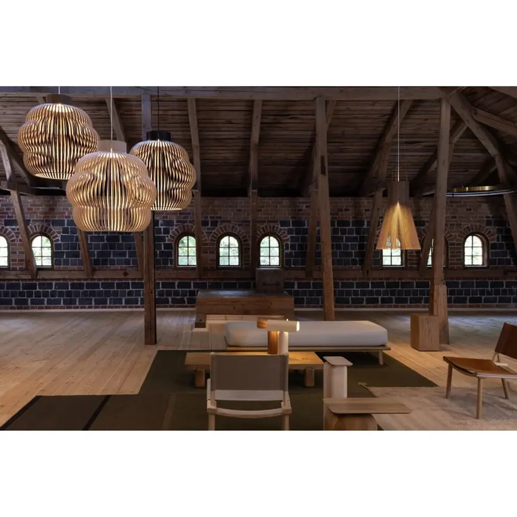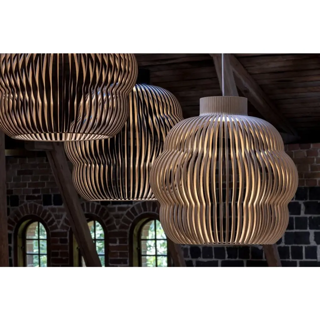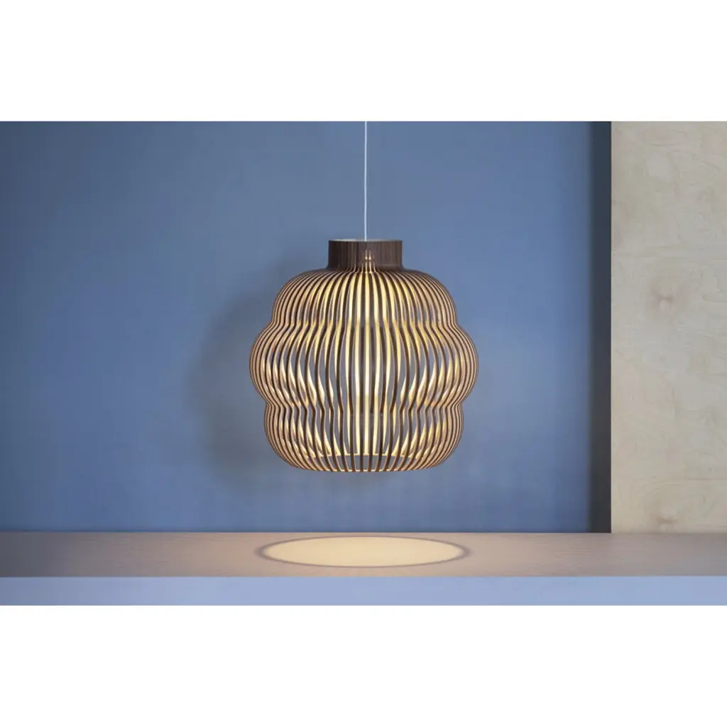 Secto Design's Kumulo 5200 pendant light captivates with its blend of softly diffused light and flowing shapes created by wooden slats. Finnish architect Seppo Koho drew inspiration for Kumulo's design language from the elements of northern nature: the cumulus clouds of the midsummer sky and the snow-laden trees of Lapland. Handcrafted in Finland from form-pressed and laminated birch and finished with walnut veneer, the Kumulo pendant lamp enchants with its timeless form, making it a stunning choice for both public spaces and homes. It works beautifully as a striking centerpiece on its own or pairs easily with other Secto Design lights in a larger arrangement.