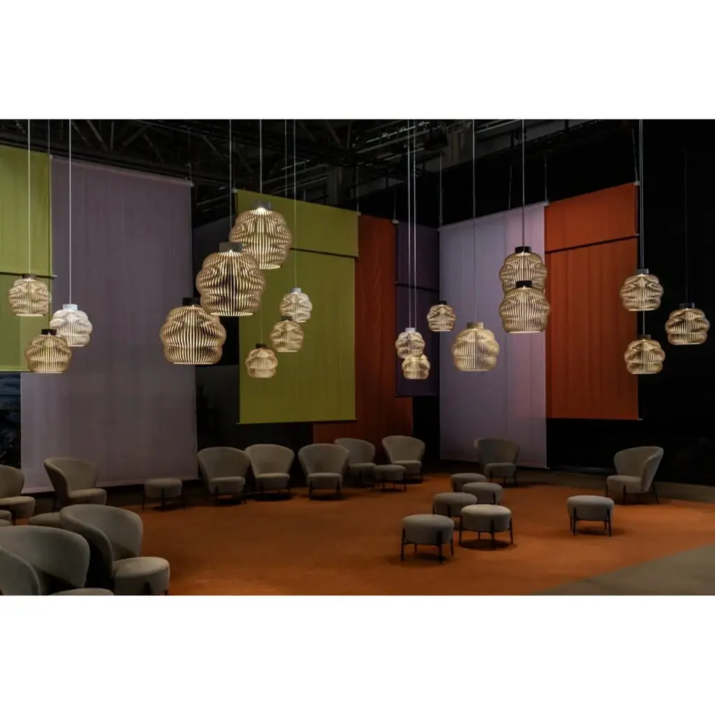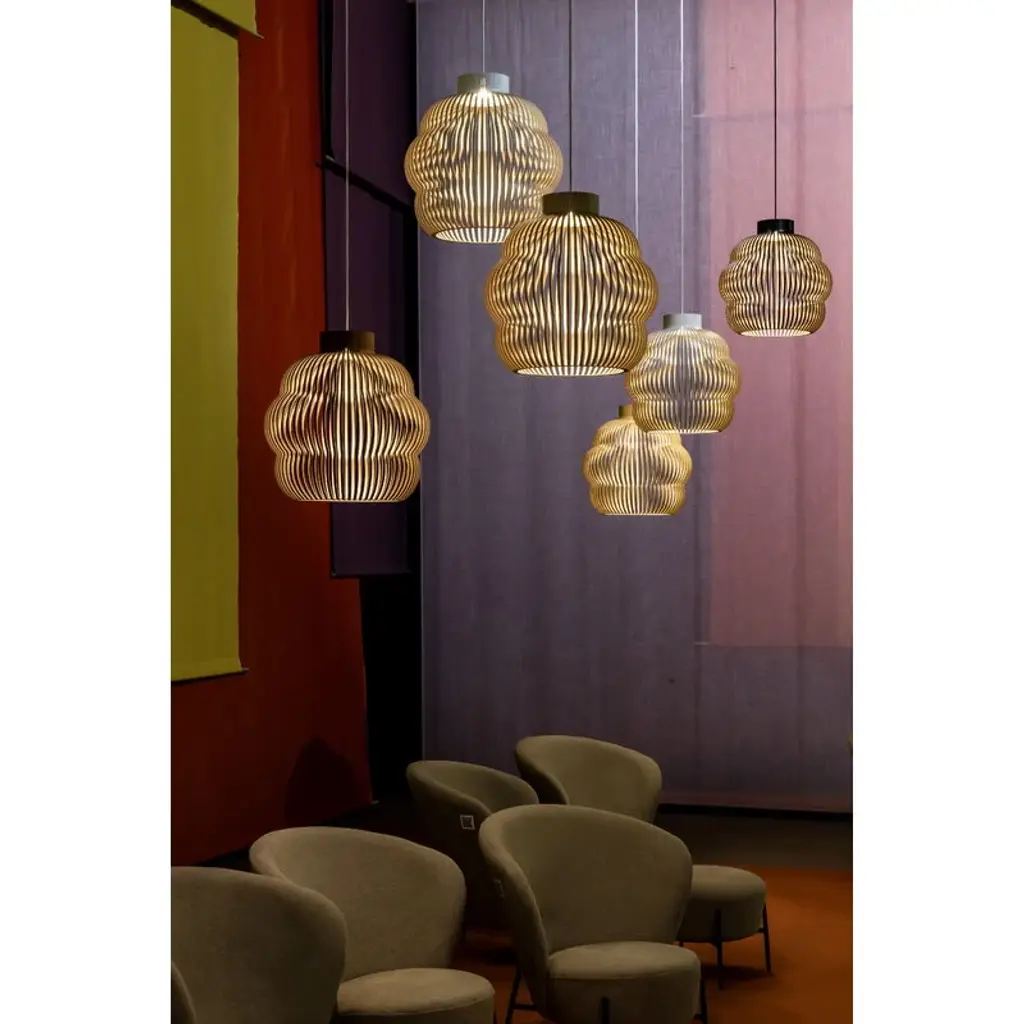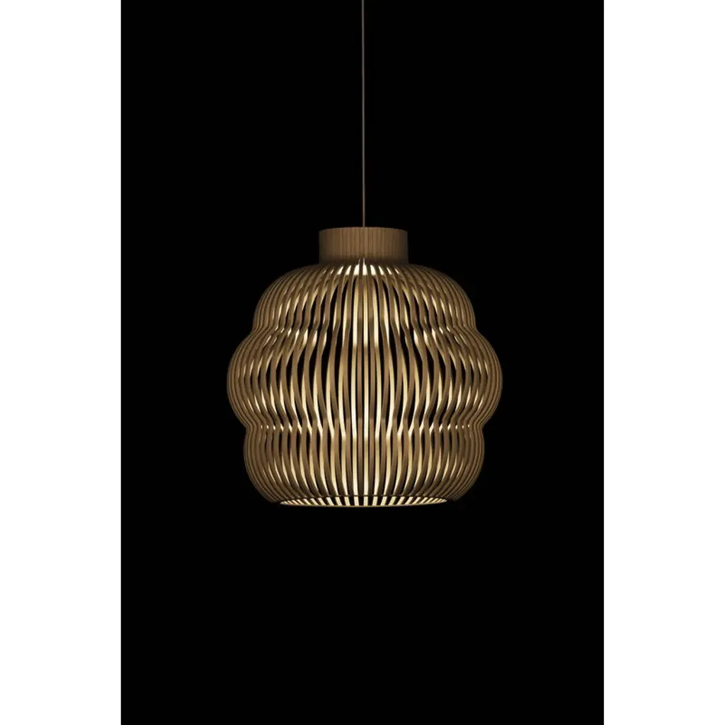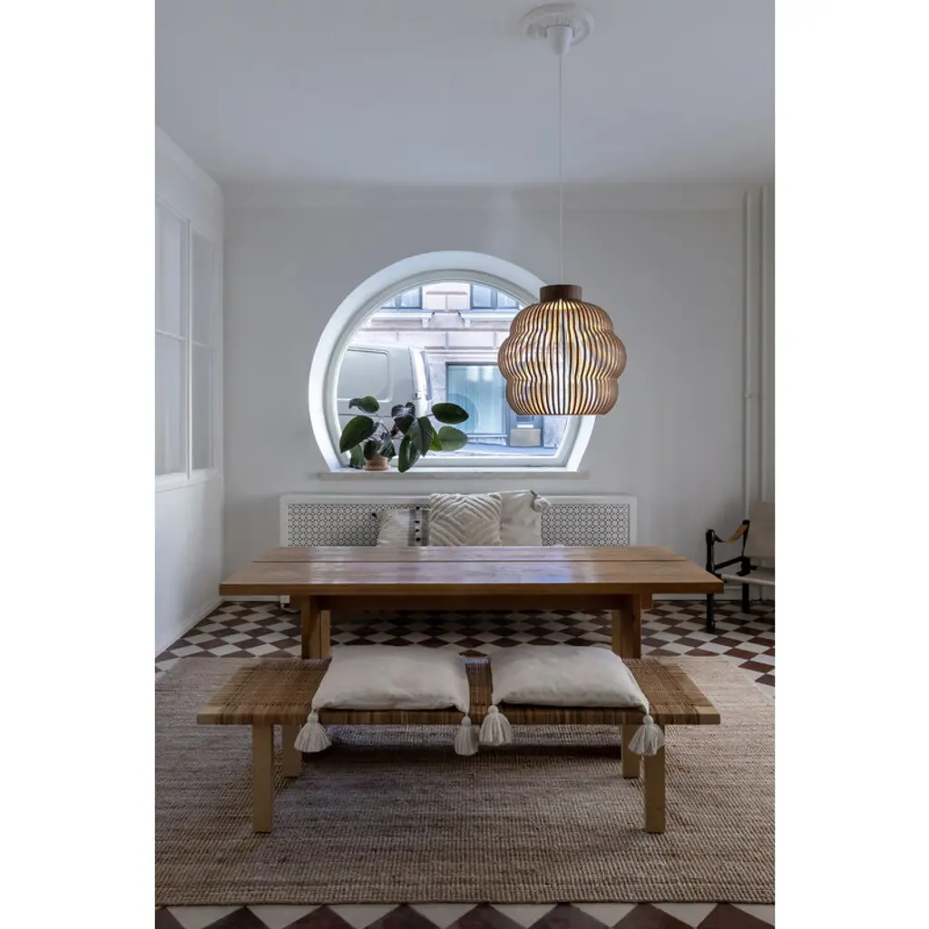Secto Design's Kumulo 5200 pendant light captivates with its blend of softly diffused light and flowing shapes created by wooden slats. Finnish architect Seppo Koho drew inspiration for Kumulo's design language from the elements of northern nature: the cumulus clouds of the midsummer sky and the snow-laden trees of Lapland. Handcrafted in Finland from form-pressed and laminated birch and finished with walnut veneer, the Kumulo pendant lamp enchants with its timeless form, making it a stunning choice for both public spaces and homes. It works beautifully as a striking centerpiece on its own or pairs easily with other Secto Design lights in a larger arrangement.