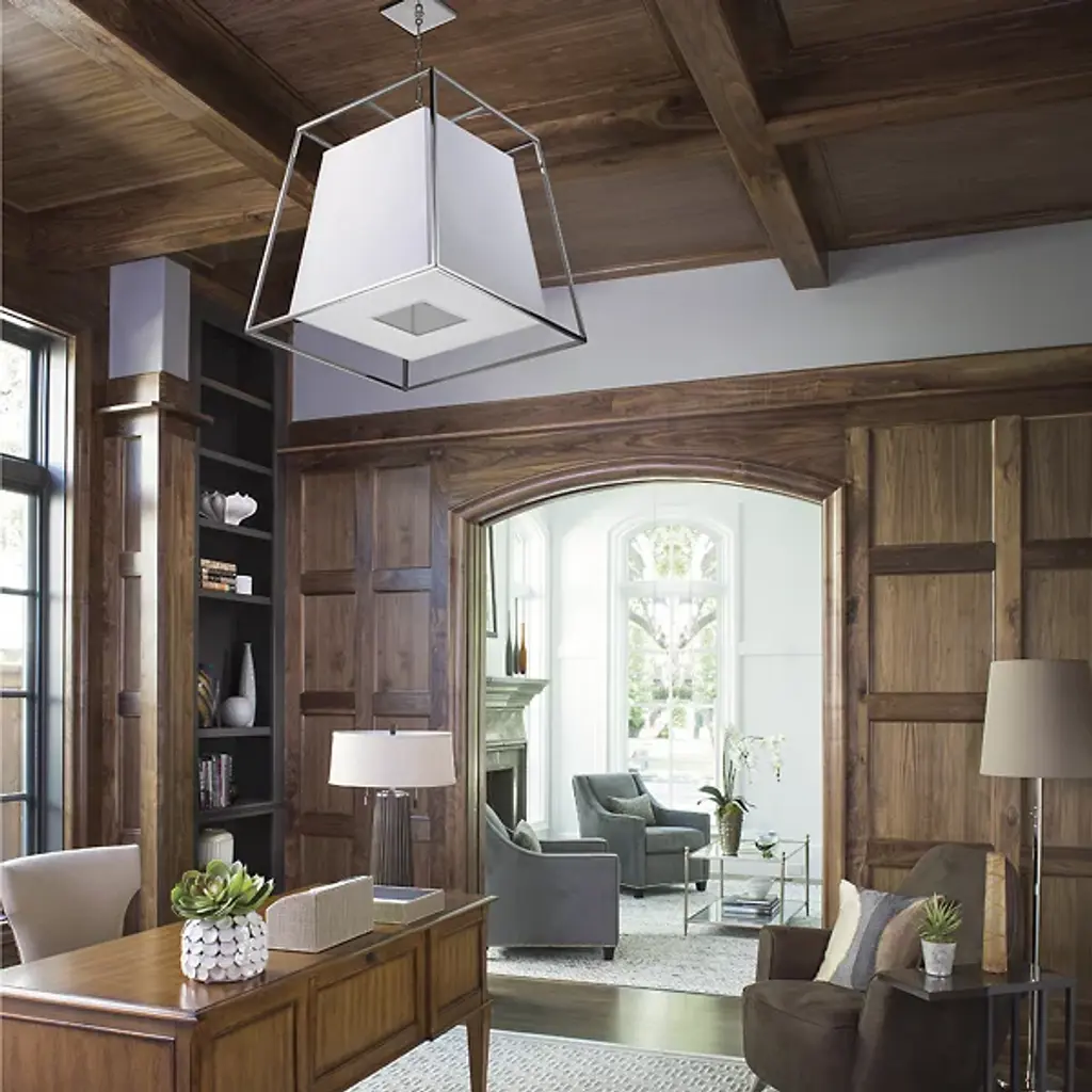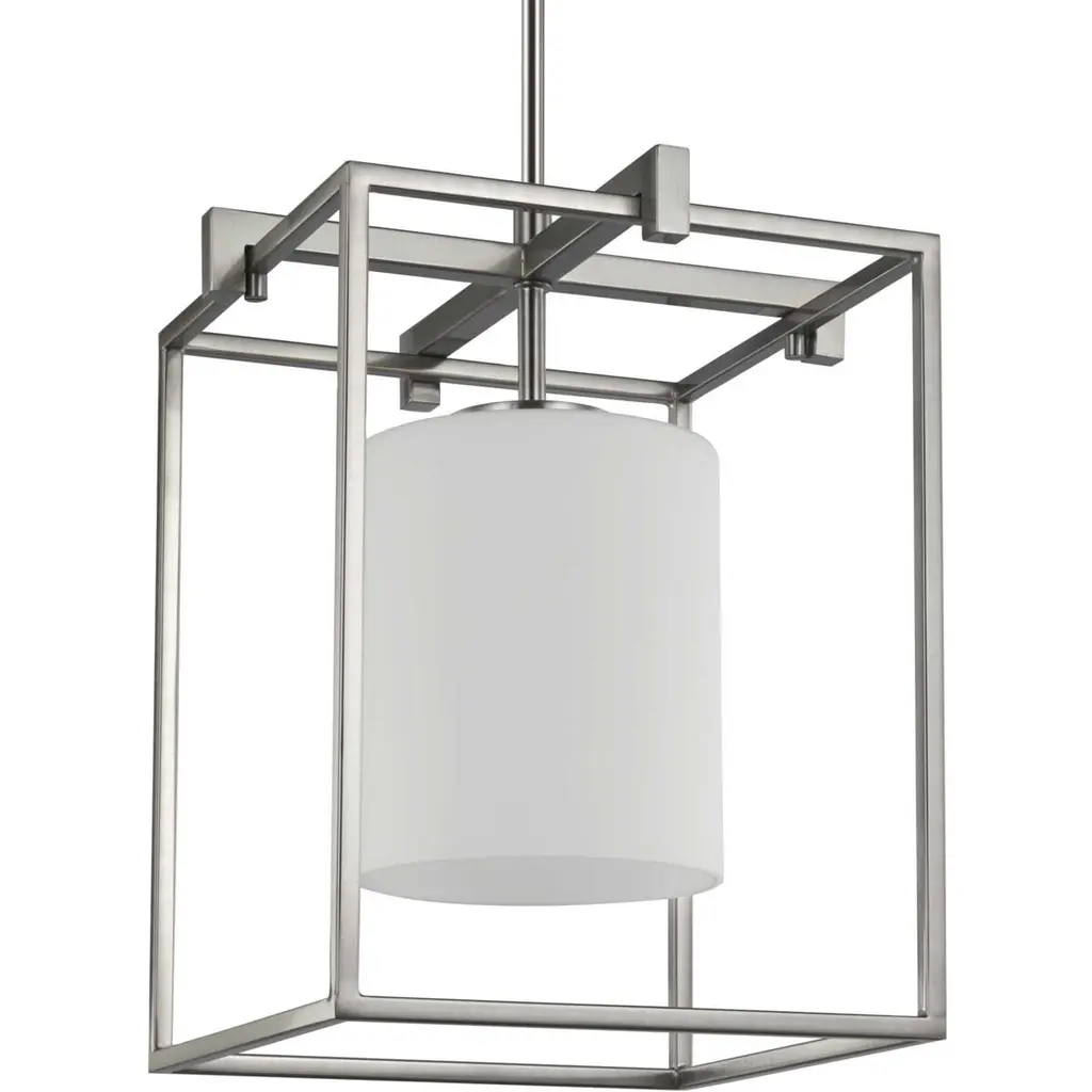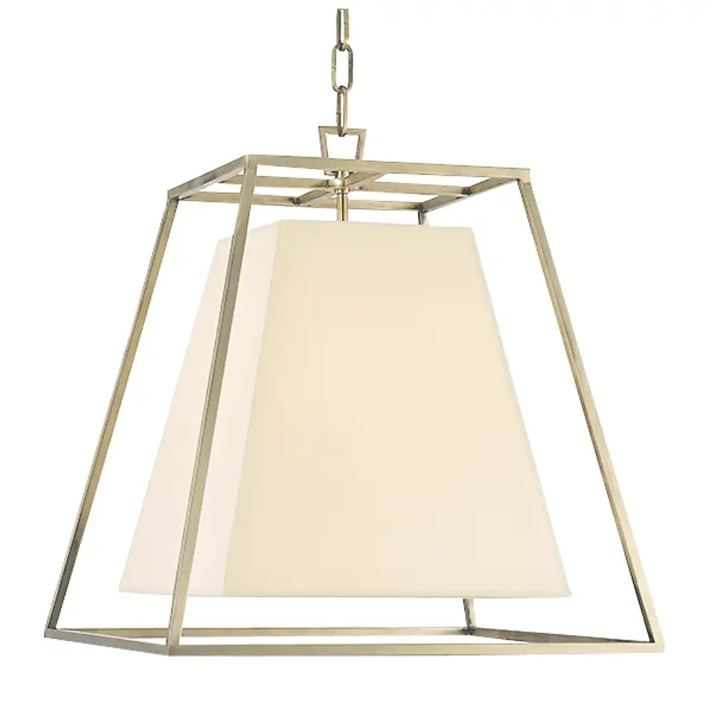 A geometric juxtaposition. The Hudson Valley Lighting Kyle Pendant suspends a crisp-cornered flared shade inside an airy framework of cast metal angles. The shade features a small, square aperture beneath, which makes it appear somewhat buttoned up. This heaviness is directly contrasted by the frame's light lines and delicate suspension, reinforcing the duality of this modern design. It comes with a Ring & Hook Shade Attachment to make assembling this product easy, and it hangs from 54 inches of included chain.