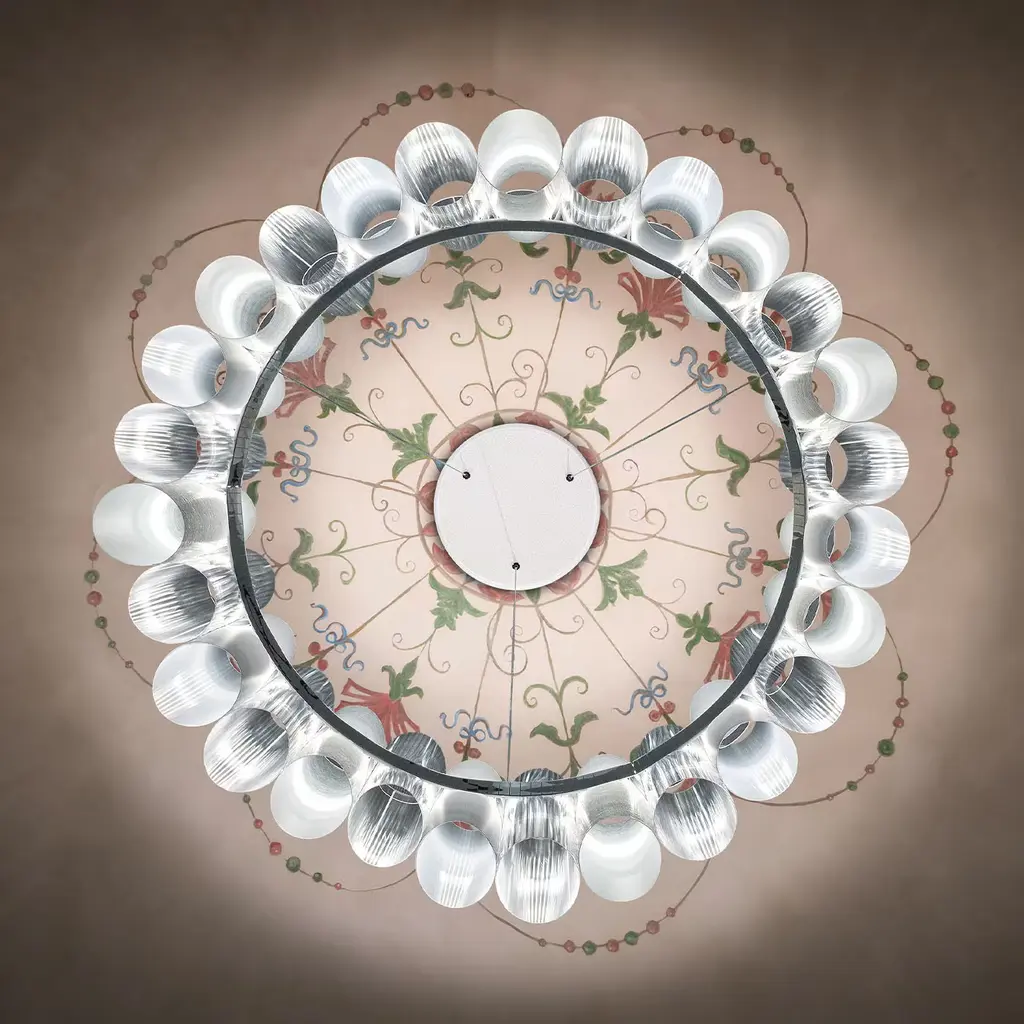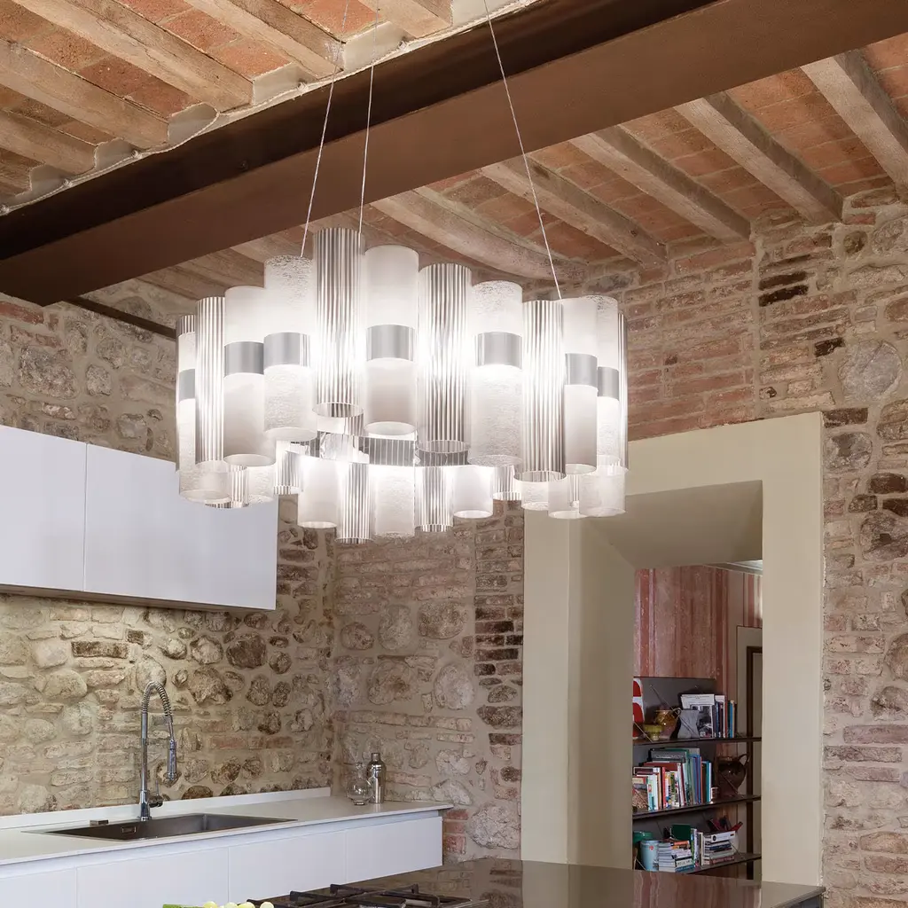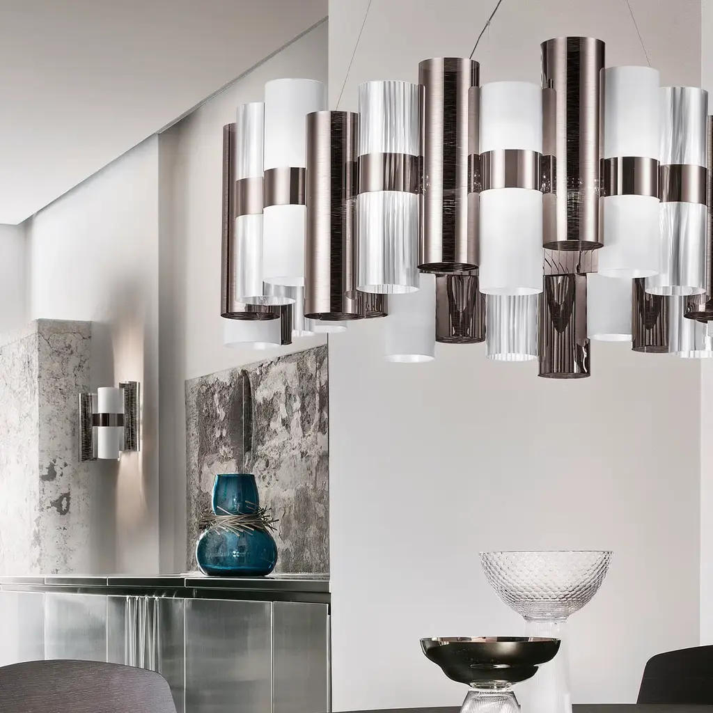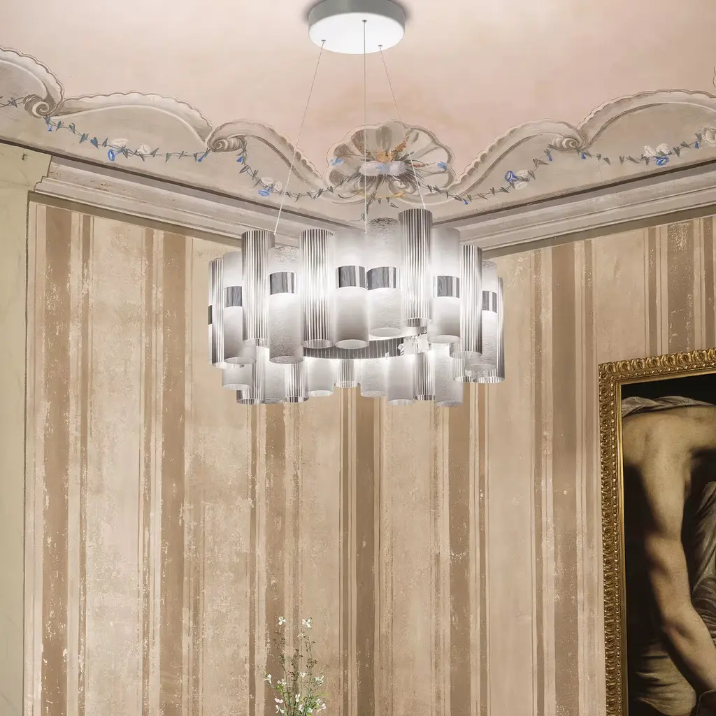 Perfect for adding a glamorous accent in a living or dining room, this pendant lamp features an elaborate body composed of gray and white techno-polymer cylinders alternating at different heights on a single tier. This exclusive design by Lorenza Bozzoli conveys an opulent aesthetic inspired by the 1950s style and a fabulous glow generated by the internal light source reflecting on the shimmering pewter metal rings and the smooth and striped surface of the diffusers.