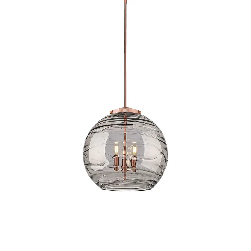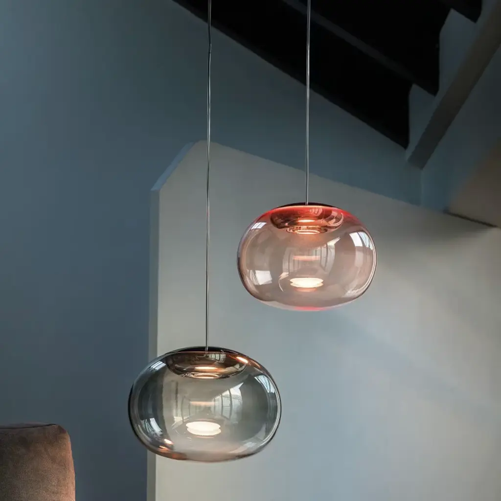Pendant chandeliers in blown transparent glass, LED source housing in white painted aluminum, and white rose window. This pendant lamp is suitable for cluster compositions and dimmable phase-cut. Single emission pendant luminaires for indoor application. The warm white LED light source with a general lighting light distribution is composed of 18 topled LEDs.