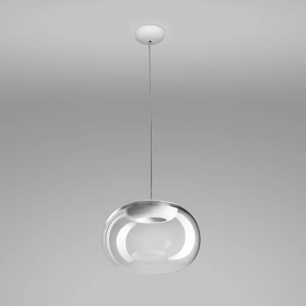 Pendant chandeliers in blown transparent glass, LED source housing in white painted aluminum. This pendant lamp is suitable for cluster compositions and dimmable phase-cut. Single emission pendant luminaires for indoor application. The warm white LED light source with a general lighting light distribution is composed of 18 topled LEDs.