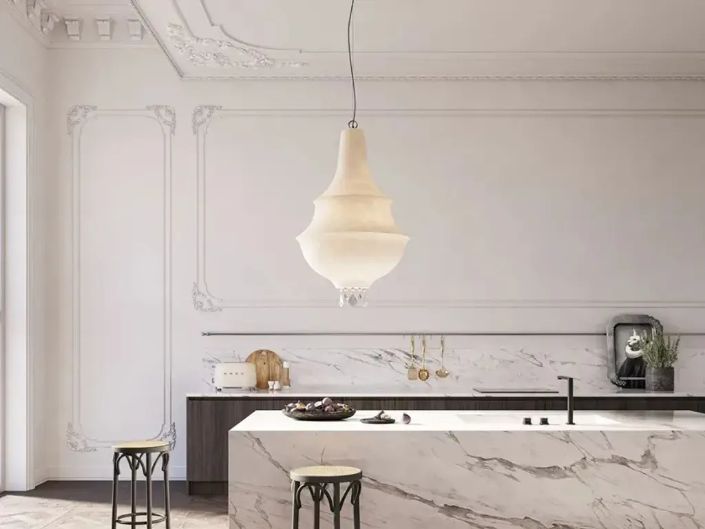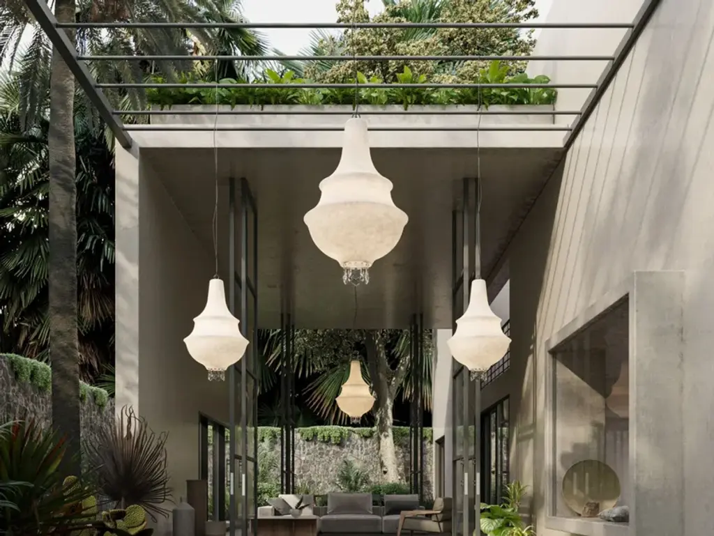 Lady D is an LED pendant lamp for indoor and outdoor use. Lamp body in matt white fibreglass, ceiling rose in matt black metal. Available in two sizes. Light source: E27, 1x max 18W LEDLady D retains all the elegance and class of a crystal chandelier, of high lineage but with simple and sincere demeanours. A white fiberglass diffuser enhances the silhouette of the collection, from which crystal drops hang down in the pendant version. The floor version, without the crystal drops, can be moved thanks to a ring on the top of the diffuser.