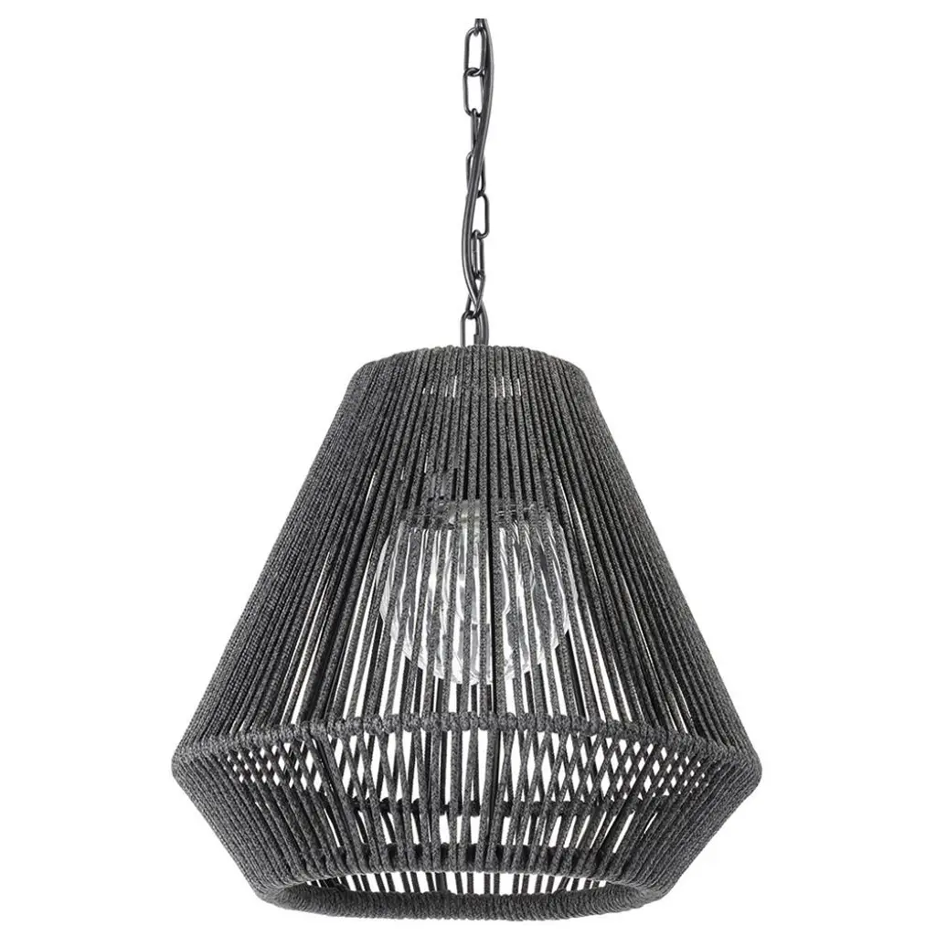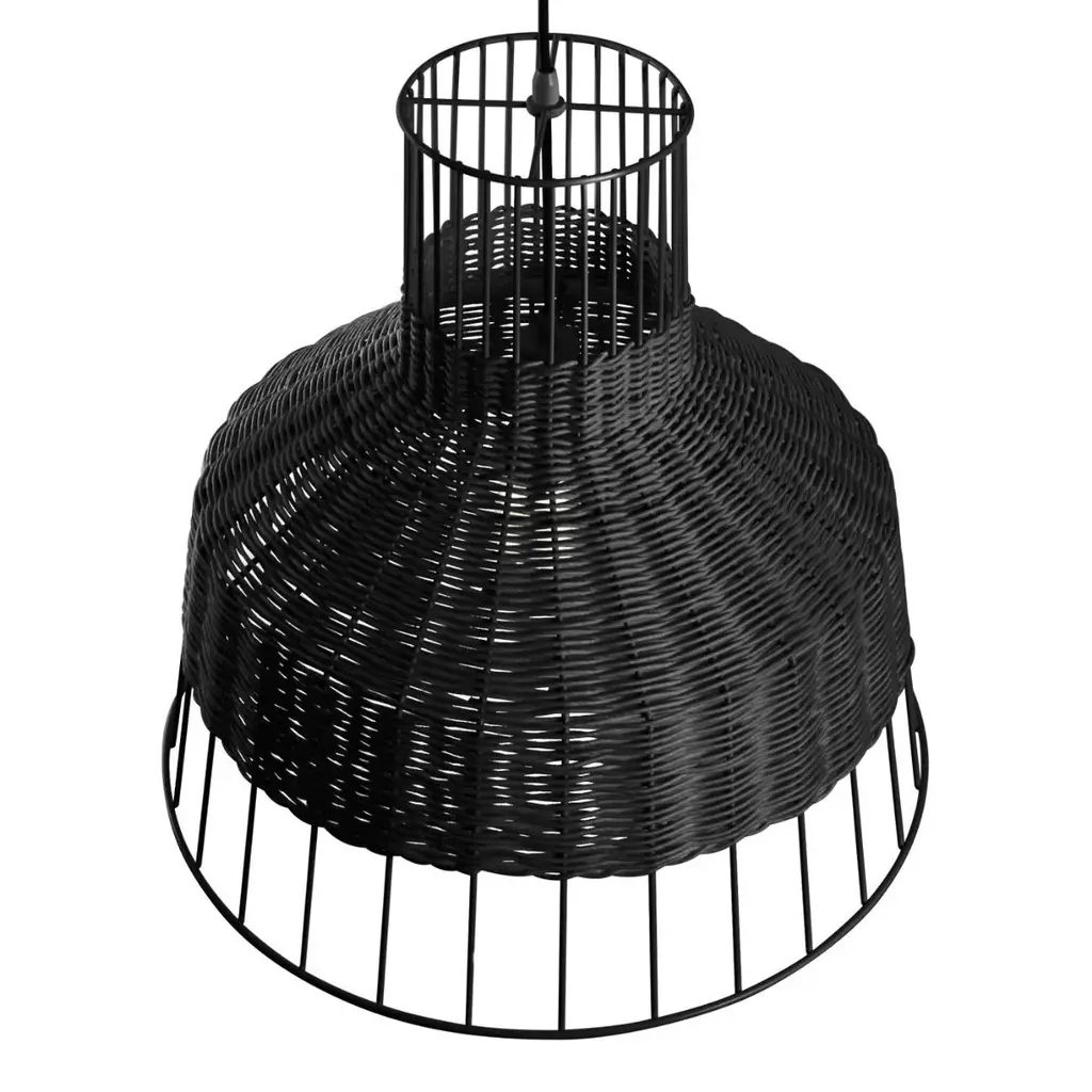 Rattan wraps around a svelte steel structure to tease its form and leave the rest to the imagination. Mounts from the ceiling and creates a showy motif of peekaboo light.