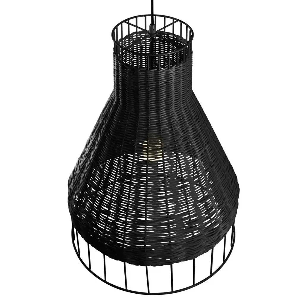 Rattan wraps around a svelte steel structure to tease its form and leave the rest to the imagination. Mounts from the ceiling and creates a showy motif of peekaboo light.