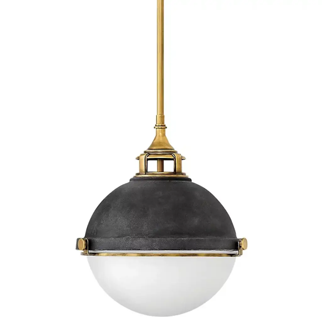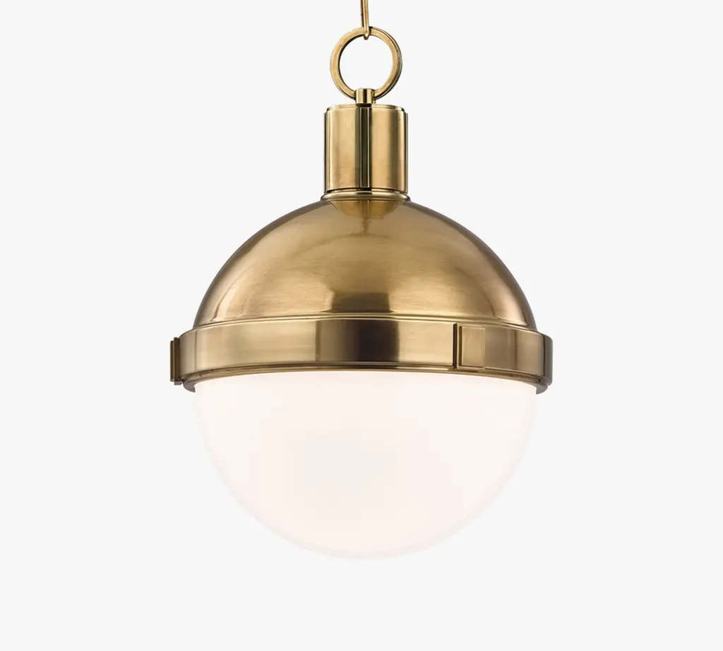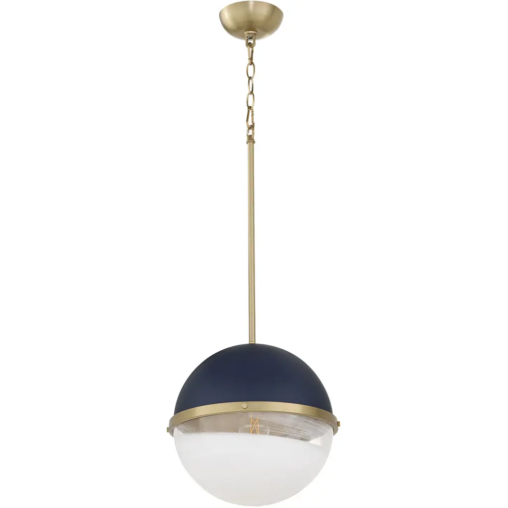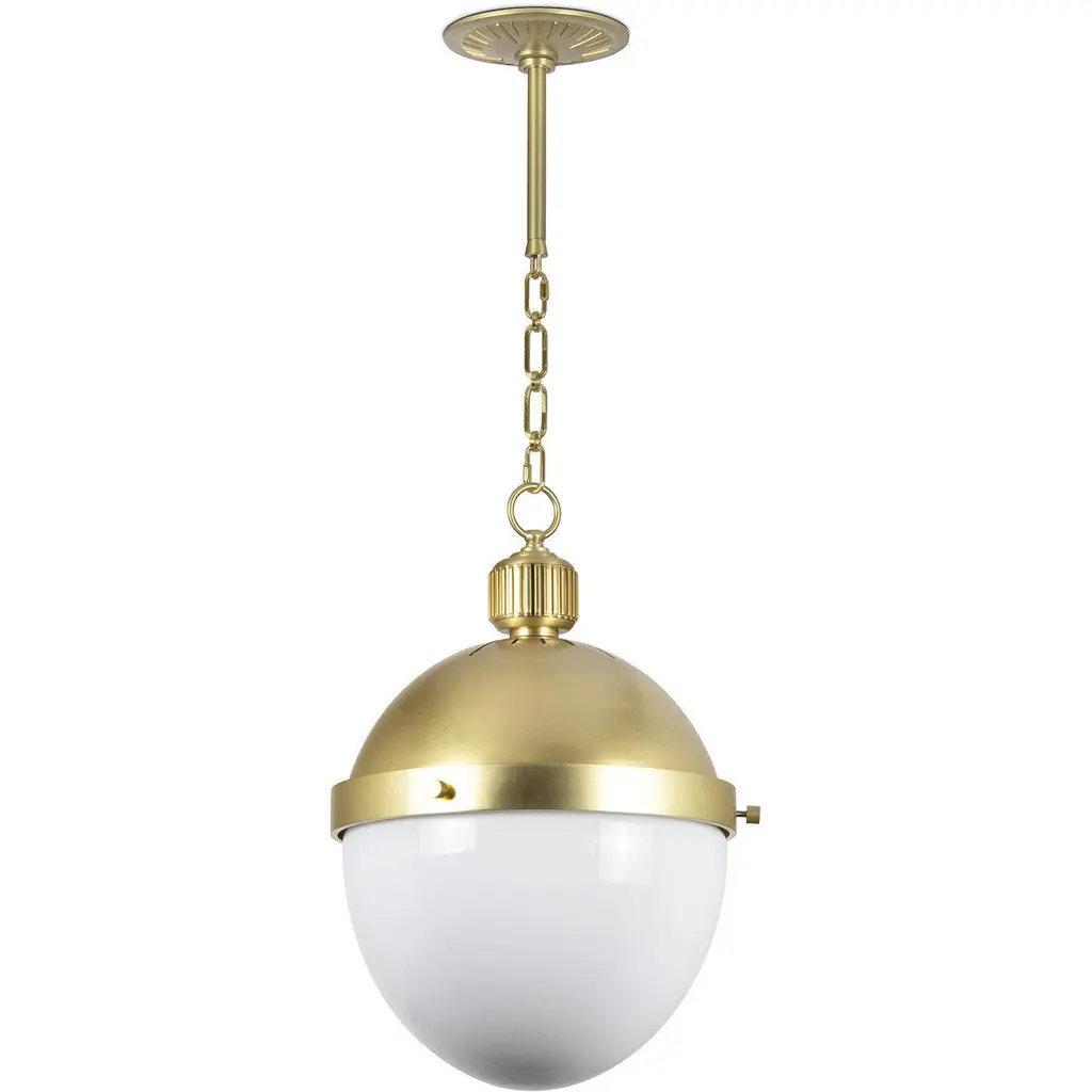 The Hudson Valley Lambert Pendant is a shining sphere with beautiful balance. It pairs smooth metal with glowing glass, the overall orb completed and complemented by an equator line collar with square accents. The final piece unites focused task light with soft ambience.