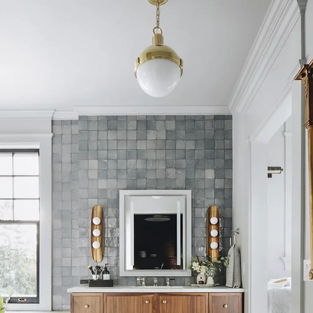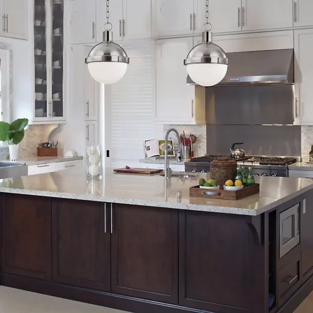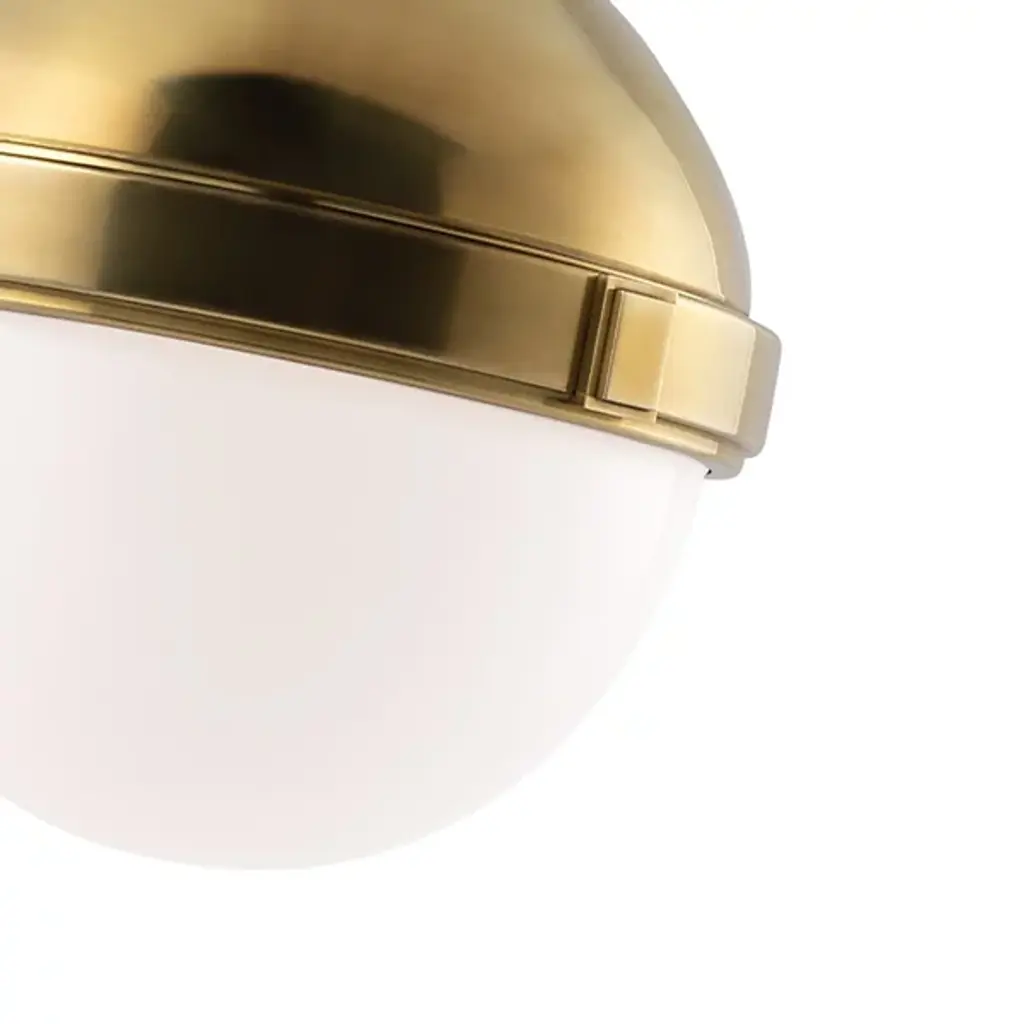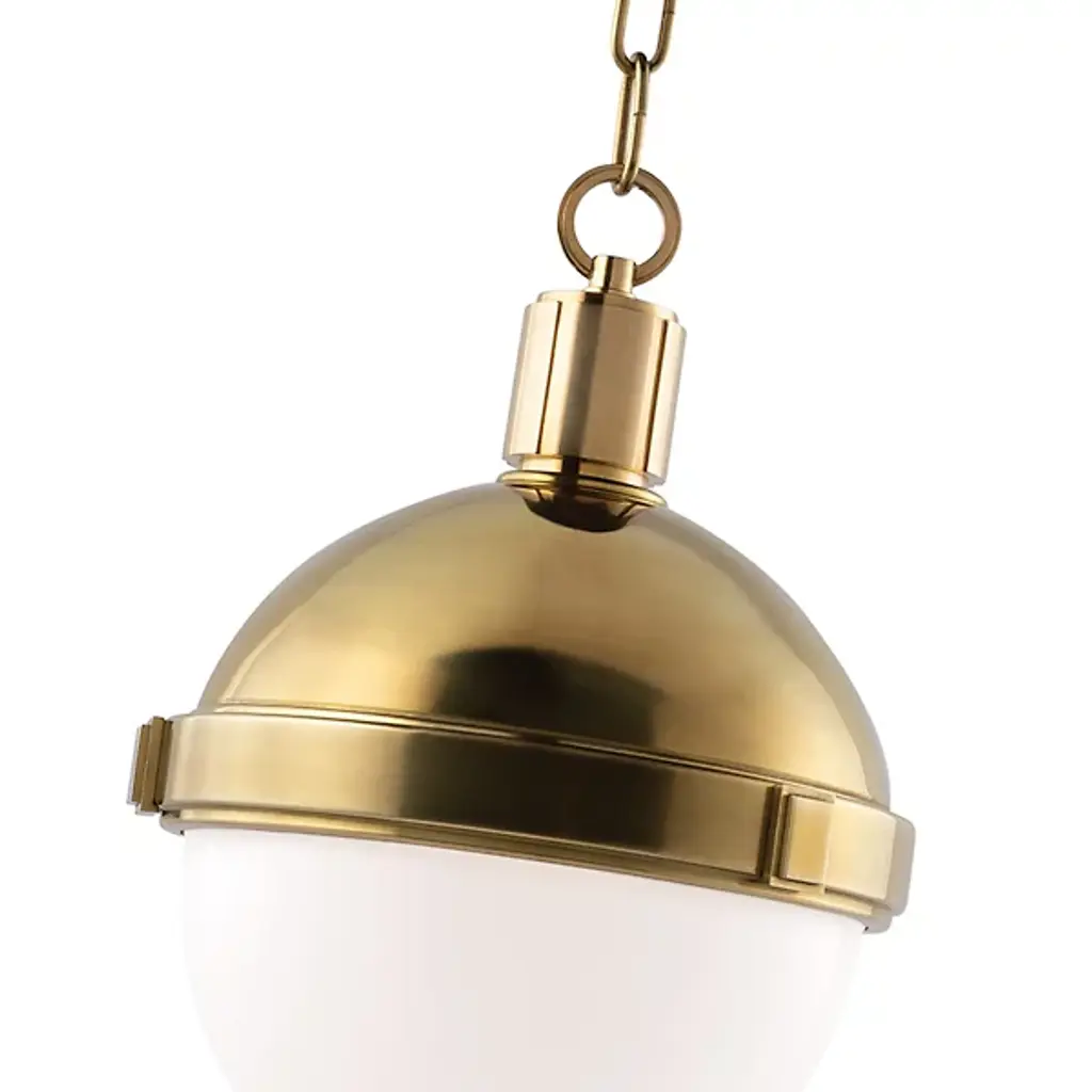 The Hudson Valley Lambert Pendant is a shining sphere with beautiful balance. It pairs smooth metal with glowing glass, the overall orb completed and complemented by an equator line collar with square accents. The final piece unites focused task light with soft ambience.