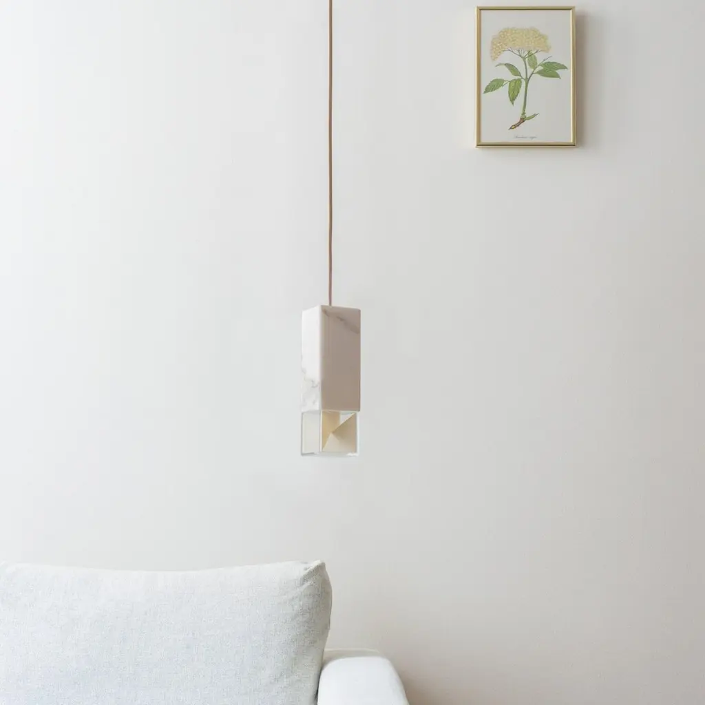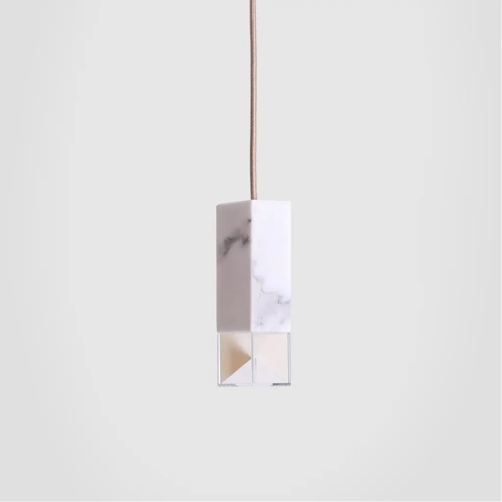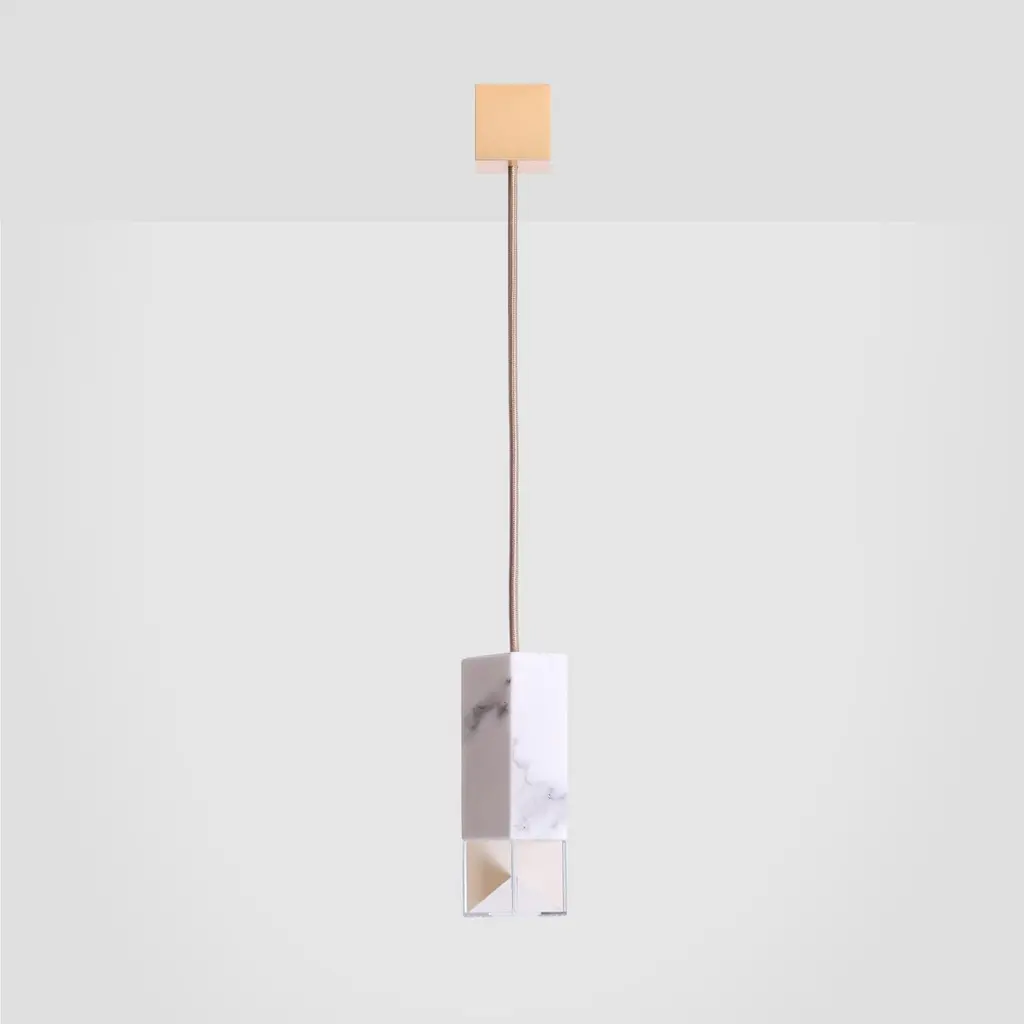 Lamp one in marble by FormaminimaDimensions: 5 x 5 x H 17 cmMaterials: lamp body in Calacatta marbleUltra- thin anti-reflection crystal diffuserInside- diffuser Limoges biscuit-finish porcelain sheetsSatin brass ceiling rose H 5 x 5 x 5 cmLight source supplied per lamp:LED 1xG9 max 2.6W, 50-60Hz G9 connection320lm 2700K Rc 80 EU standard compliantVoltage: 220-240v (120v available upon request)Supplied accessories:Adjustable fabric cable: 2 x 0.75 Ø 6.2 mm L 2mMounting kit: screws UX Fischer screws (2x)Ø 6mm x 30mm, satin brass ceiling roseDecorative pendant lamp for indoor use.Both The Single Suspension series as well as The Chandelier series are characterized by the same endless passion for simplicity and attention for details that best representus. The inspiration, as well as the genesis of the entire design process, that led to the creation of the collection, belongs to the world of Porcelain, to its surface andstructural characteristics. Therefore, our project was born from the exploration of two-dimensional geometries on one hand, and on the other one, from the design intentaimed at researching lightness and thinness, bringing them to unforeseen results. As a consequence, this was a path subject to curiosity, to research, to the story of how alight beam may transform the features of a marble surface becoming translucent, and a porcelain sheet turning as thin as an eggshell.Formaminima is an emerging brand within the Italian Design panorama, prone to exploring the concept of object itself, in the field of lighting and product designin its broadest sense. This exploration starts in the first instance from the tradition, from the artisan mastery and that making full of charm, care, and perseverance.Each project is in fact crafted in those same places where the know-how is handed down and kept for generations, exclusively in our territory. Carefully selected workshops, ateliers, and studios become our precious partners in the creation of every single piece, conceived and designed by us. Therefore, in this latter, multiple knowledge is merged, especially that linked to high-quality materials, production processes, and an innovative aesthetic. Thus to achievewhat for us represents a contemporary Design Sleek Poetry.We create value through the masterly realization of unique pieces, as well as minimizing the intermediation between the Design product and its audience. Hence our projects result in the outcome of a direct collaboration between our designers and the excellence of Italian craftsmanship, along with its valuable know-how. To this end, we believe that a slow design process, together with its time of thought andresearch, is essential for what we believe Good Design may be.So this latter, passing from the inspiration to the concrete realization of each of our design creation, arrives directly to the customer.