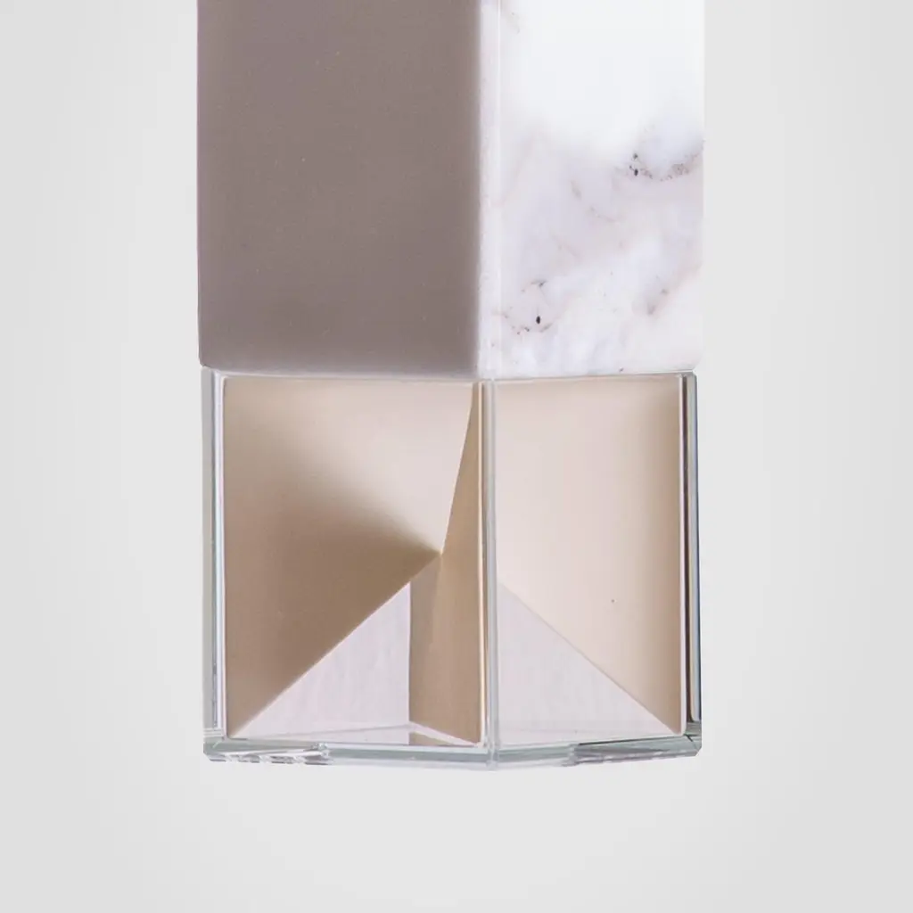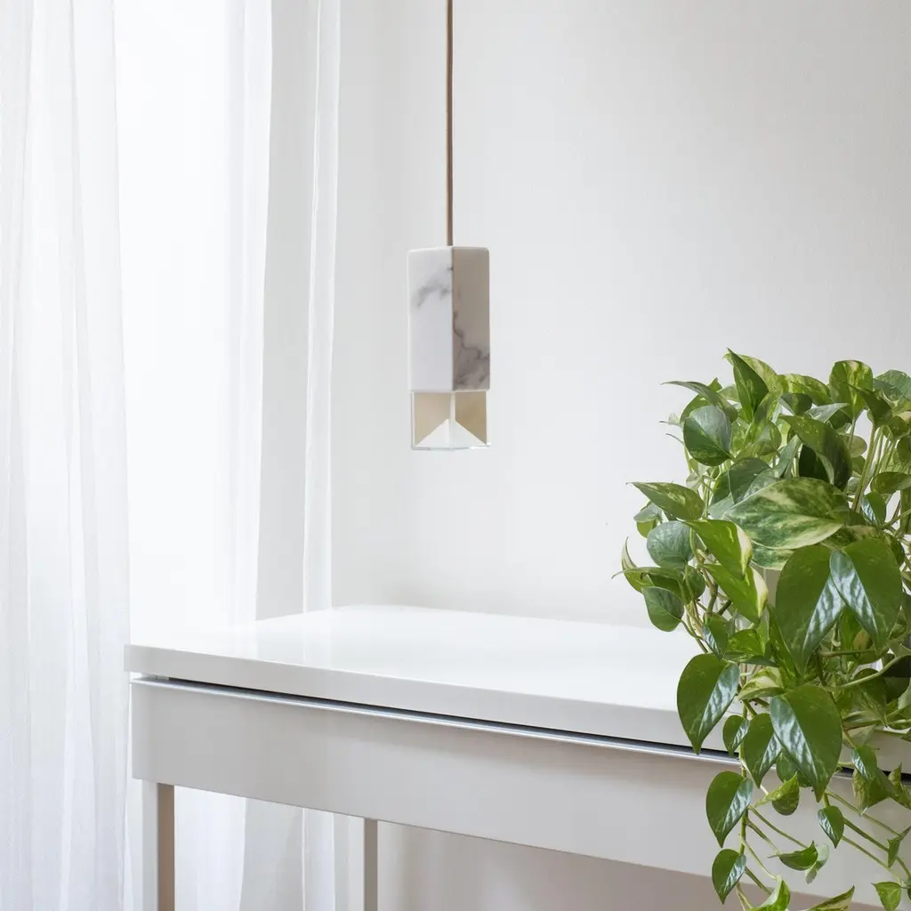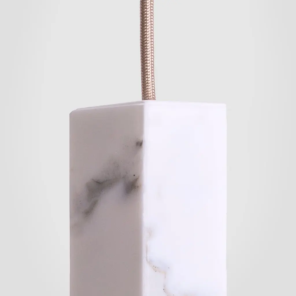 Lamp one in marble by FormaminimaDimensions: 5 x 5 x H 17 cmMaterials: lamp body in Calacatta marbleUltra- thin anti-reflection crystal diffuserInside- diffuser Limoges biscuit-finish porcelain sheetsSatin brass ceiling rose H 5 x 5 x 5 cmLight source supplied per lamp:LED 1xG9 max 2.6W, 50-60Hz G9 connection320lm 2700K Rc 80 EU standard compliantVoltage: 220-240v (120v available upon request)Supplied accessories:Adjustable fabric cable: 2 x 0.75 Ø 6.2 mm L 2mMounting kit: screws UX Fischer screws (2x)Ø 6mm x 30mm, satin brass ceiling roseDecorative pendant lamp for indoor use.Both The Single Suspension series as well as The Chandelier series are characterized by the same endless passion for simplicity and attention for details that best representus. The inspiration, as well as the genesis of the entire design process, that led to the creation of the collection, belongs to the world of Porcelain, to its surface andstructural characteristics. Therefore, our project was born from the exploration of two-dimensional geometries on one hand, and on the other one, from the design intentaimed at researching lightness and thinness, bringing them to unforeseen results. As a consequence, this was a path subject to curiosity, to research, to the story of how alight beam may transform the features of a marble surface becoming translucent, and a porcelain sheet turning as thin as an eggshell.Formaminima is an emerging brand within the Italian Design panorama, prone to exploring the concept of object itself, in the field of lighting and product designin its broadest sense. This exploration starts in the first instance from the tradition, from the artisan mastery and that making full of charm, care, and perseverance.Each project is in fact crafted in those same places where the know-how is handed down and kept for generations, exclusively in our territory. Carefully selected workshops, ateliers, and studios become our precious partners in the creation of every single piece, conceived and designed by us. Therefore, in this latter, multiple knowledge is merged, especially that linked to high-quality materials, production processes, and an innovative aesthetic. Thus to achievewhat for us represents a contemporary Design Sleek Poetry.We create value through the masterly realization of unique pieces, as well as minimizing the intermediation between the Design product and its audience. Hence our projects result in the outcome of a direct collaboration between our designers and the excellence of Italian craftsmanship, along with its valuable know-how. To this end, we believe that a slow design process, together with its time of thought andresearch, is essential for what we believe Good Design may be.So this latter, passing from the inspiration to the concrete realization of each of our design creation, arrives directly to the customer.