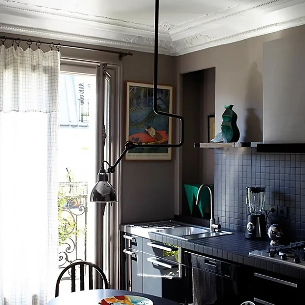Display daring interior design with the crisp and expressive silhouette of the Lampe Gras N°312 Pendant by DCW editions. Designed in 1921 by Bernard-Albin Gras, this fixture was created to provide attractive and functional lighting for office and factory, but it shines in the home as well. Its slender, single-stem body is fashioned from robust steel and descends from a circular canopy, curving down and over at multiple pivot points before ending at an adjustable shade. A single lamp channeled by the shade’s smooth interior can be oriented as desired to send warm ambient or direct light in any direction.