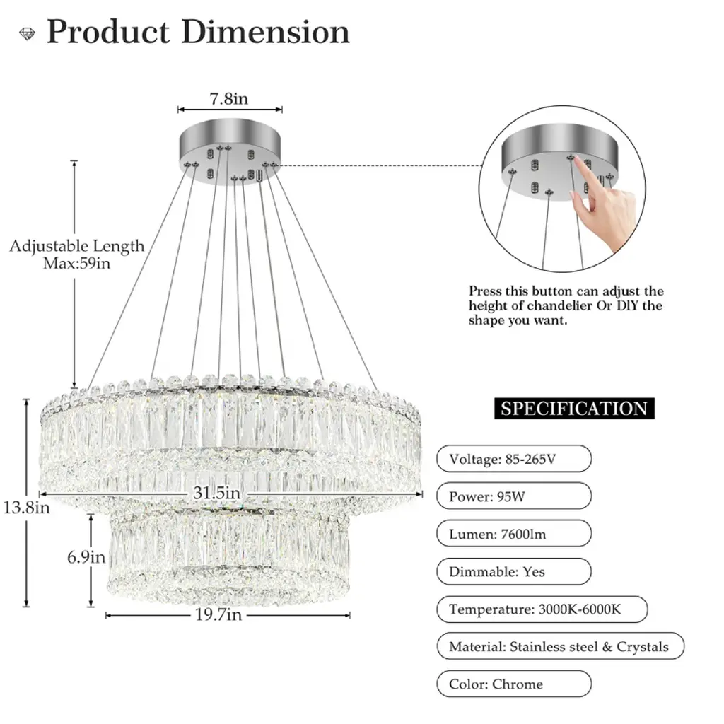Lamqee 31.5 Inch Modern Led Crystal Chandeliers For Dining Room Light Fixture Dual Ring Crystal Ceiling Pendant Lights Dimmable With Remote Control