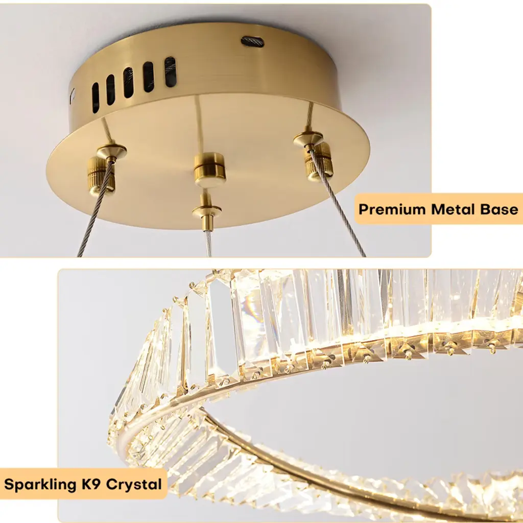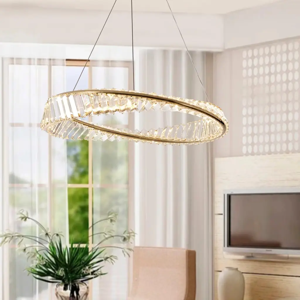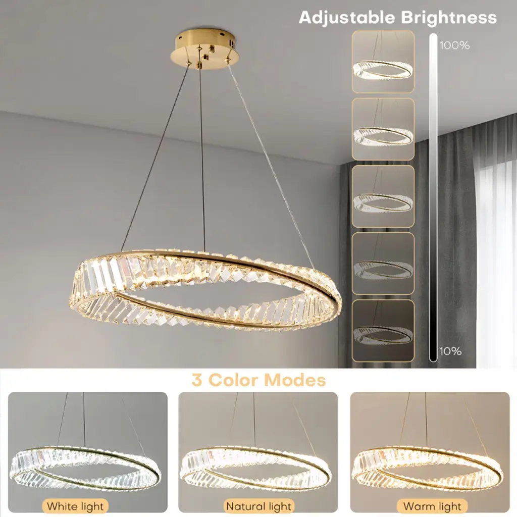This modern minimalist luxury creative circle LED crystal chandelier blends sleek design with elegant charm. It supports 3-color stepless dimming for customized lighting ambiance. Both the remote control and wall switch feature a memory function: after setting your preferred lighting, turn off the wall switch and wait 10 seconds—your settings will be saved automatically. Crafted with selected transparent crystals, it emits uniform, soft light (no glare) and creates stunning, brilliant light refraction for a textured look. The fixture’s surface undergoes high-quality electroplating treatment, ensuring rich, smooth color, rust resistance, and corrosion resistance for long-term durability.