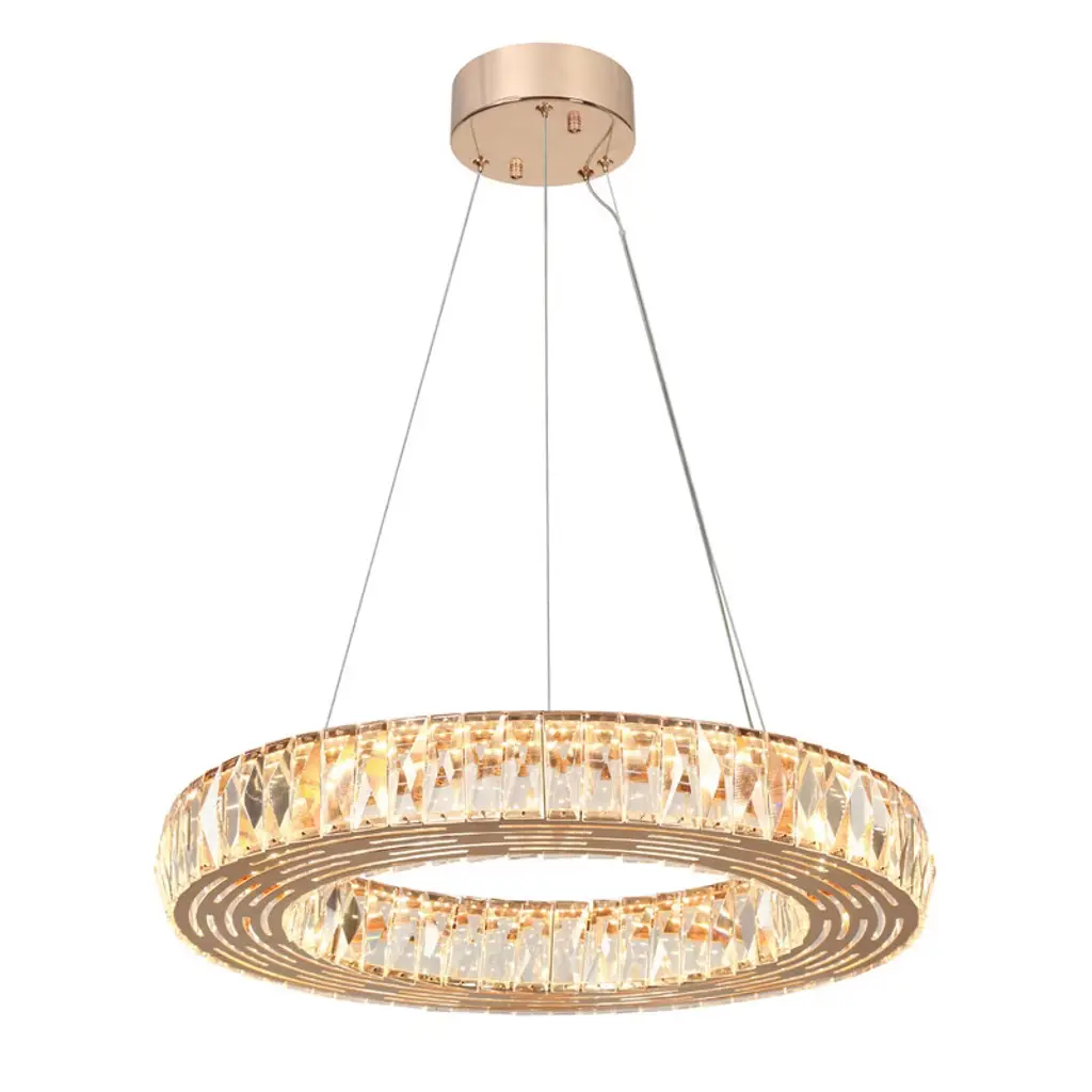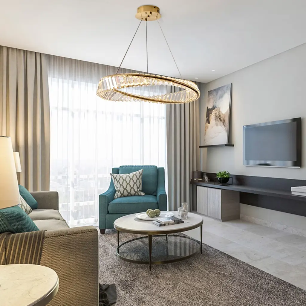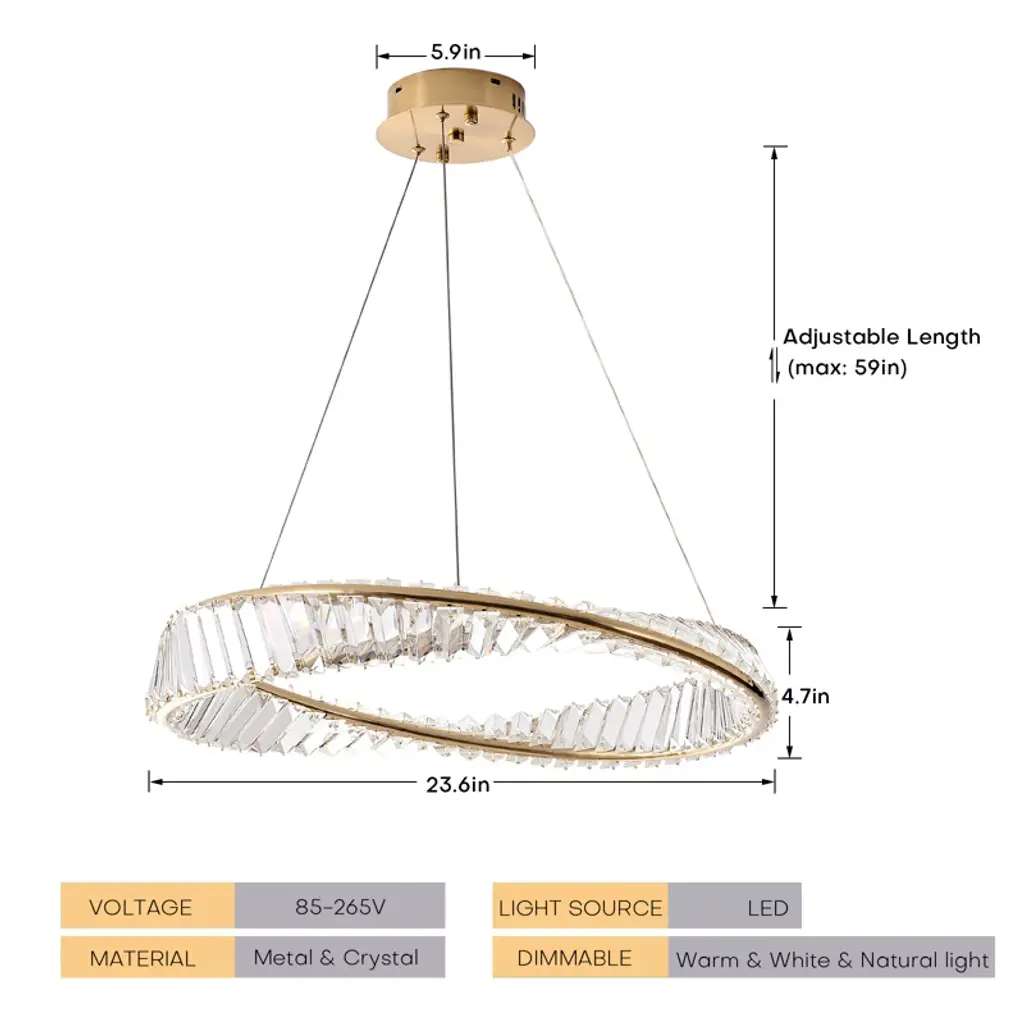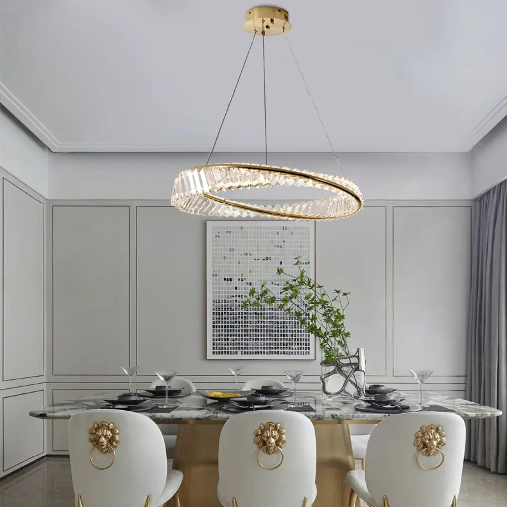 This modern minimalist luxury creative circle LED crystal chandelier blends sleek design with elegant charm. It supports 3-color stepless dimming for customized lighting ambiance. Both the remote control and wall switch feature a memory function: after setting your preferred lighting, turn off the wall switch and wait 10 seconds—your settings will be saved automatically. Crafted with selected transparent crystals, it emits uniform, soft light (no glare) and creates stunning, brilliant light refraction for a textured look. The fixture’s surface undergoes high-quality electroplating treatment, ensuring rich, smooth color, rust resistance, and corrosion resistance for long-term durability.