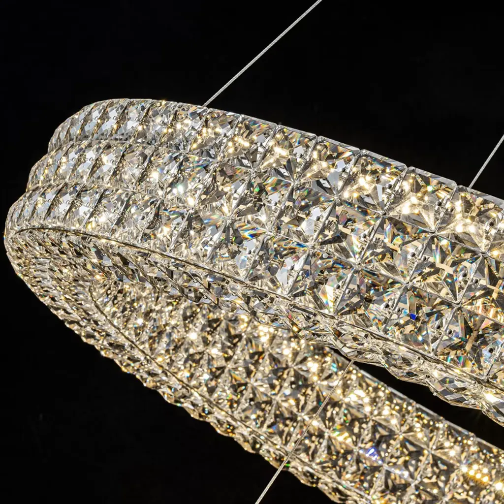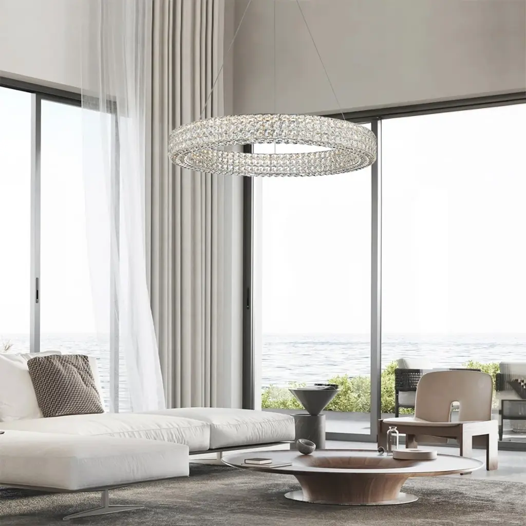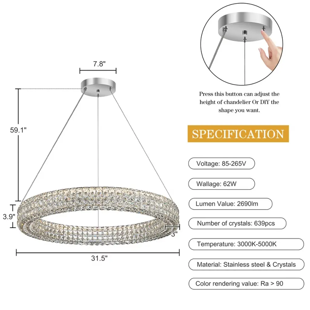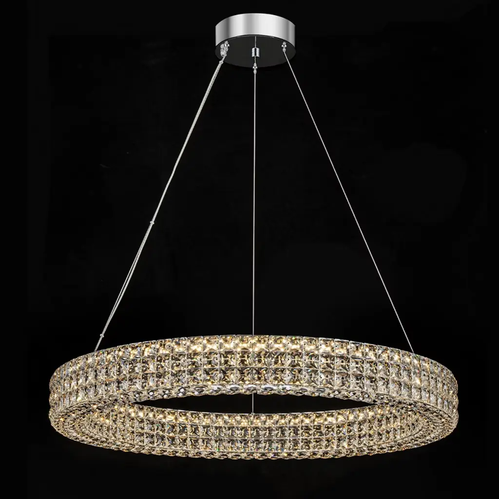 This crystal chandelier features a double-sided three-dimensional cutting method, with over 463 units small-sized crystals (1.18" x 1.18") that are hand-polished to highlight the brilliance of the ring chandelier; and the chrome circular metal enhances the chandelier's unique modernity, allowing it to seamlessly integrate into various decorative environments—traditional, luxurious, modern, and minimalist—while becoming a striking visual focal point