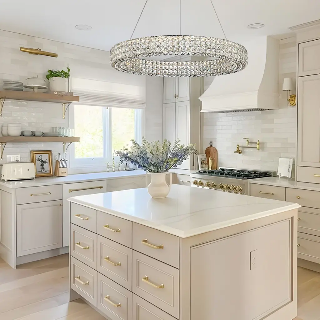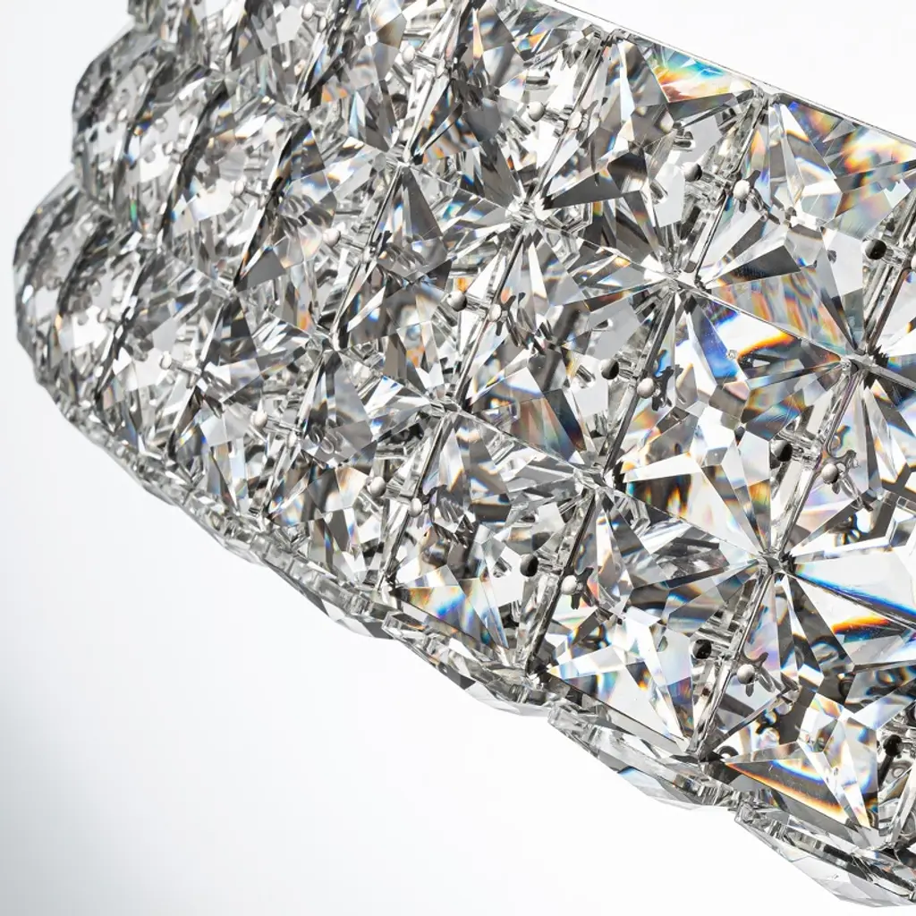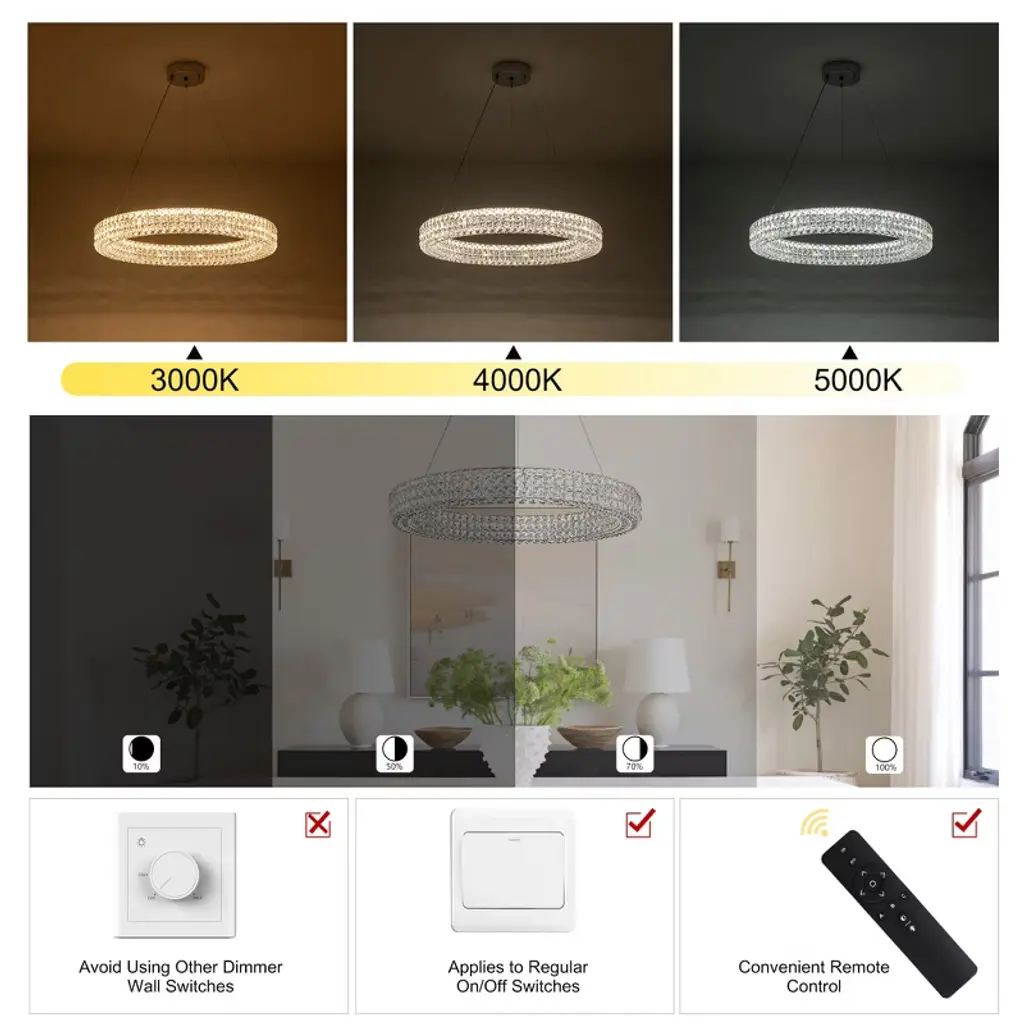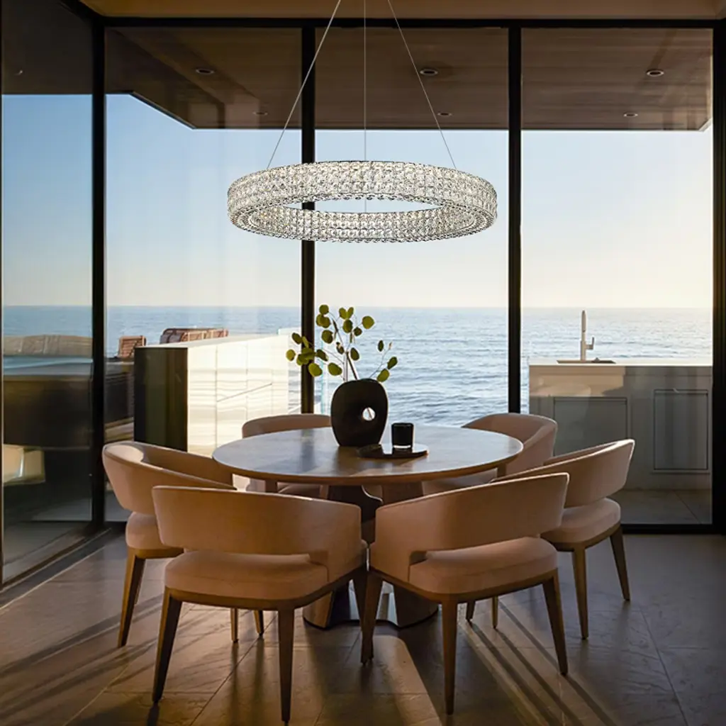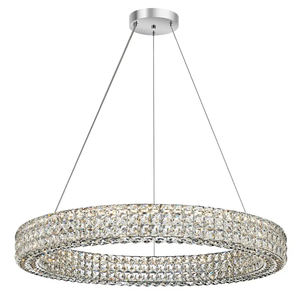 This crystal chandelier features a double-sided three-dimensional cutting method, with over 463 units small-sized crystals (1.18" x 1.18") that are hand-polished to highlight the brilliance of the ring chandelier; and the chrome circular metal enhances the chandelier's unique modernity, allowing it to seamlessly integrate into various decorative environments—traditional, luxurious, modern, and minimalist—while becoming a striking visual focal point