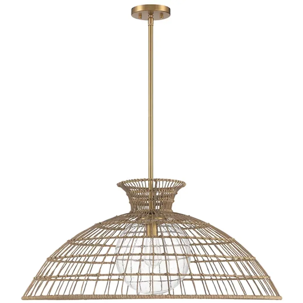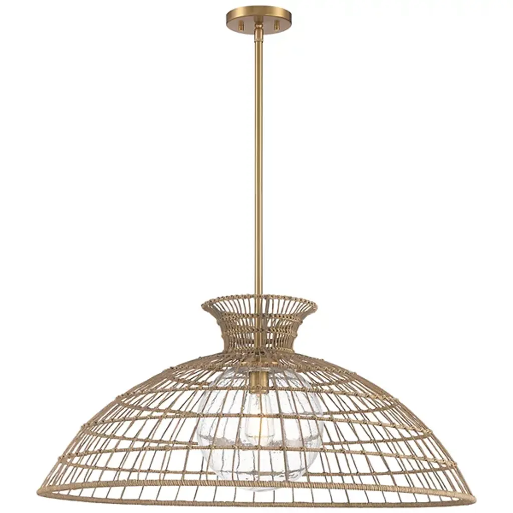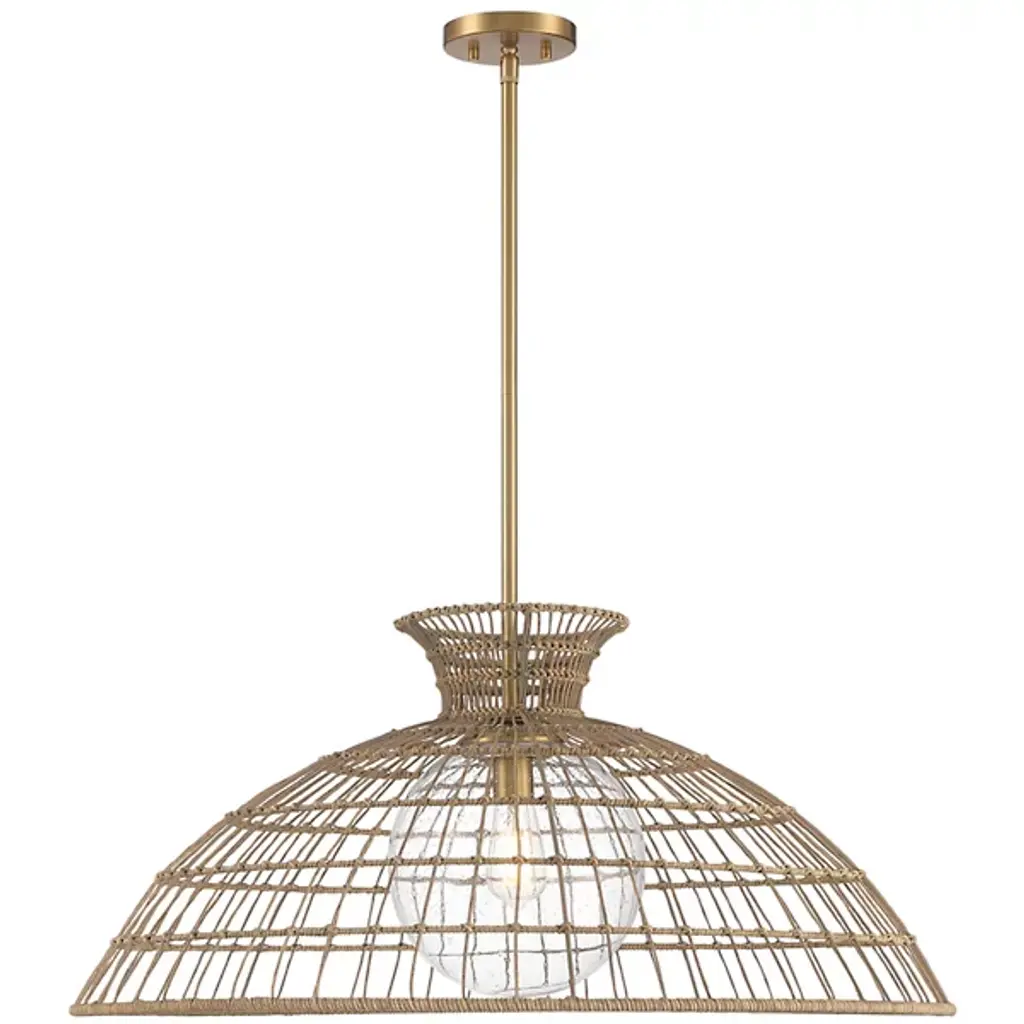 The Lanai Pendant from Savoy House brings rattan-inspired design to outdoor spaces. Its basket-like shade is crafted from weather-resistant rattan resin, encasing an inner shade of clear seeded glass. This combination creates an appealing textural contrast while protecting the light source. The pendant's Warm Brass finish adds a rich, complementary tone to the natural-looking shade, which results in a fixture that blends durability with aesthetic charm for exterior lighting applications.