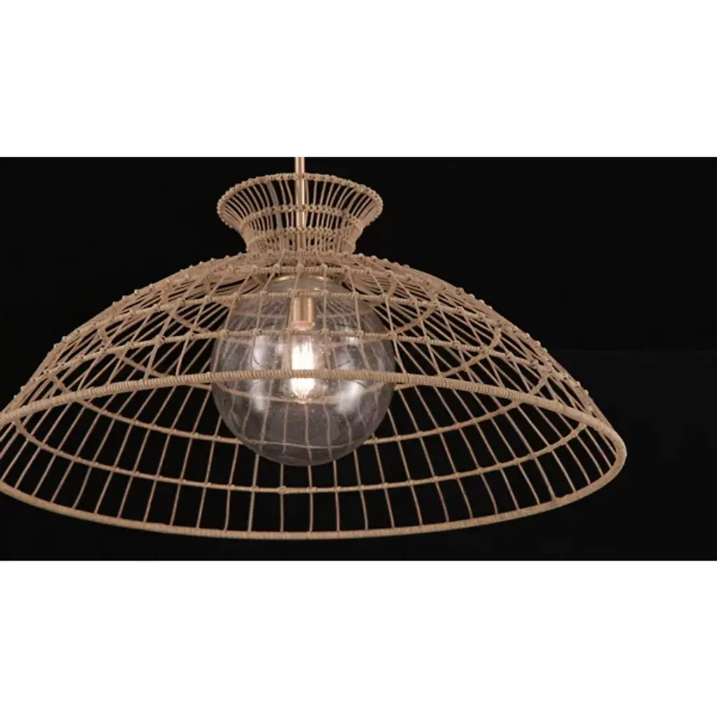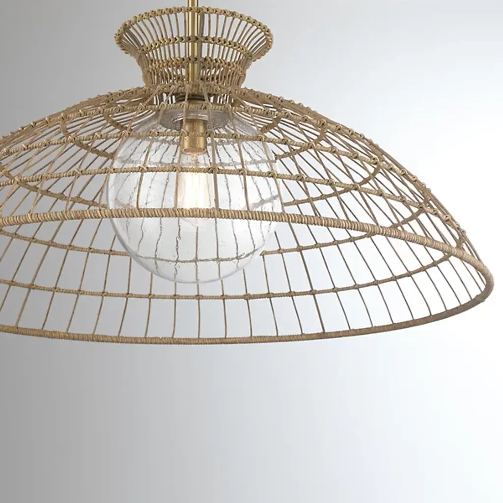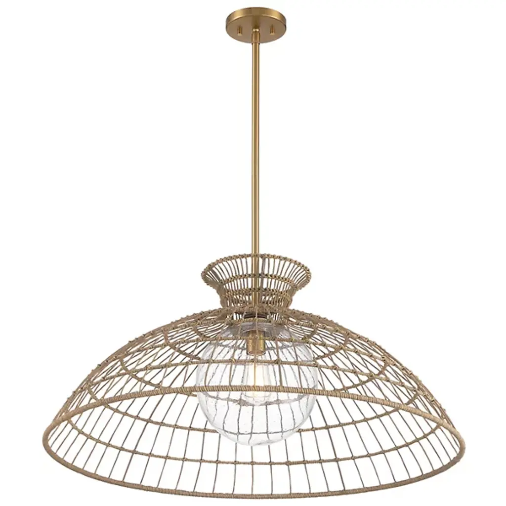 The Lanai Pendant from Savoy House brings rattan-inspired design to outdoor spaces. Its basket-like shade is crafted from weather-resistant rattan resin, encasing an inner shade of clear seeded glass. This combination creates an appealing textural contrast while protecting the light source. The pendant's Warm Brass finish adds a rich, complementary tone to the natural-looking shade, which results in a fixture that blends durability with aesthetic charm for exterior lighting applications.
