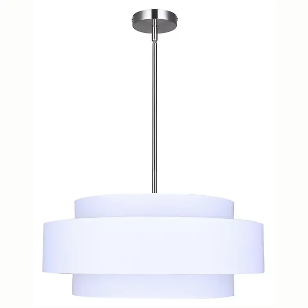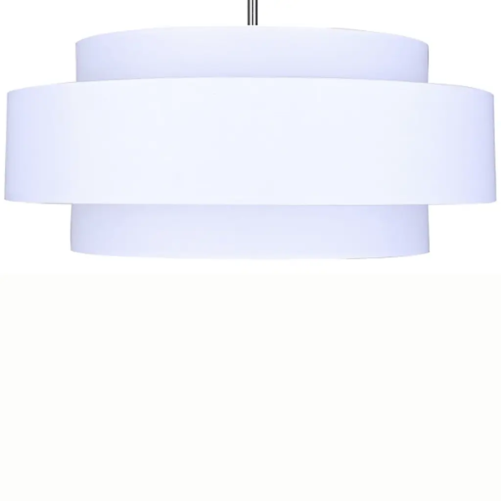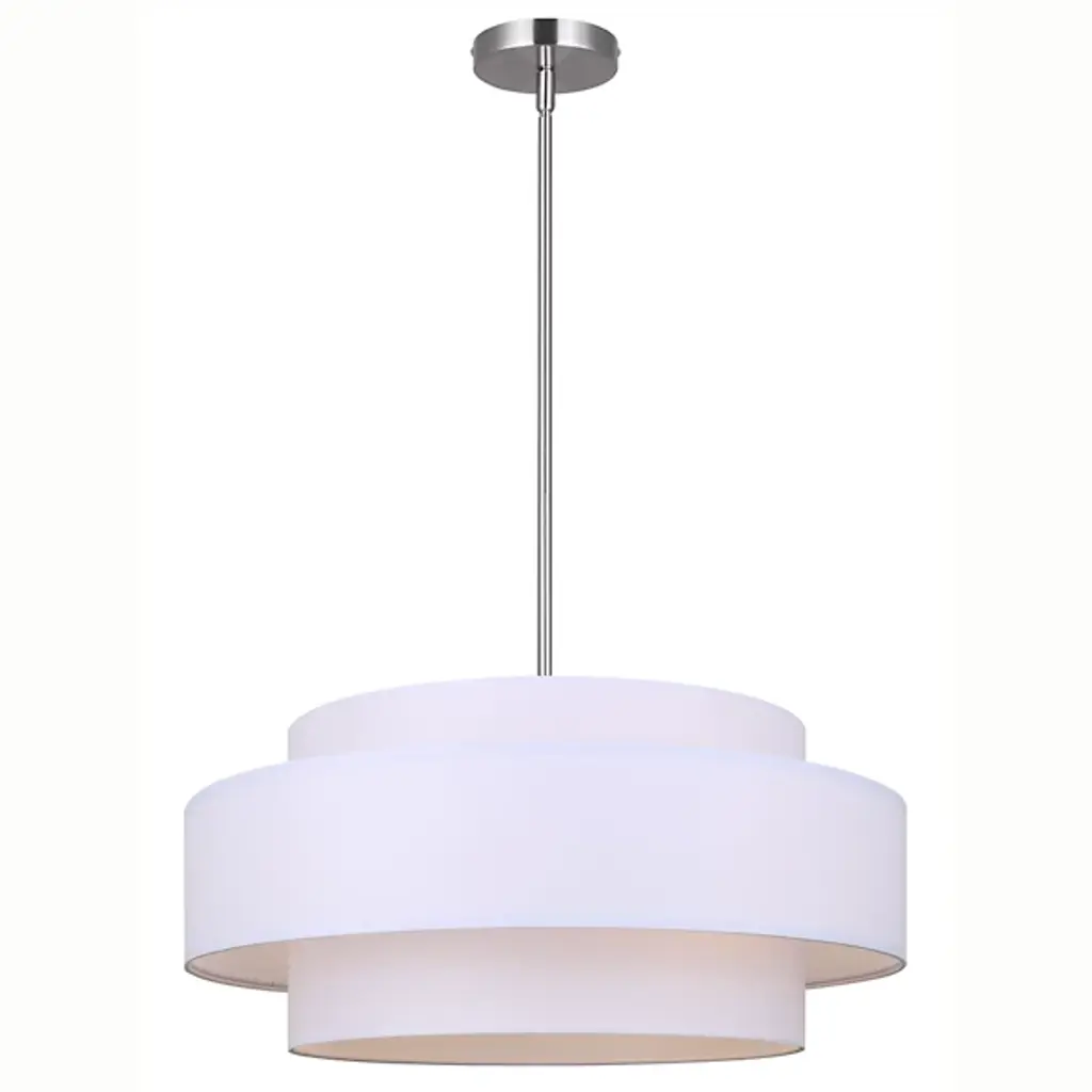 The Landra Double Pendant from Canarm presents a tiered drum shade design that creates visual intrigue through its layered composition. The shade's distinct levels create depth that typical single-layer pendants lack, adding architectural interest to dining areas and living rooms. Light filters evenly through the fabric drum, creating a gentle glow that eliminates harsh shadows in the room below. A single slender rod visually anchors the substantial shade, providing a sense of balance between the supporting structure and the primary design element. This fixture delivers a fresh interpretation of traditional drum pendant lighting through its multi-layered approach, bringing a new dimension to a familiar form.